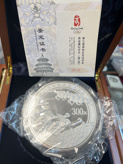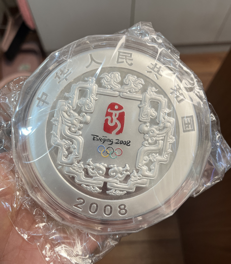 2008年奥运二组公斤银币一枚,原盒原证,银币边缘轻微氧化,外盒有些旧!