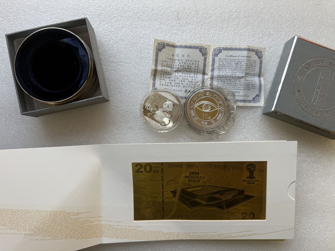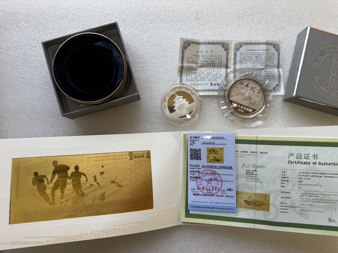 降价售2017年熊猫银币650元!售原盒千年纪念银币一蛊司650元!售原封原发*票2014年巴西世界杯纪念2克999金鈔2000元!