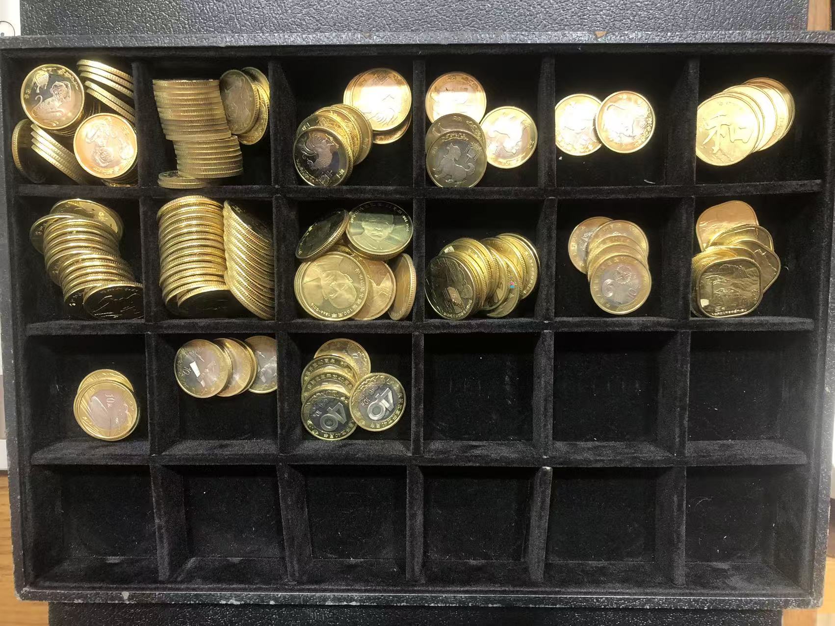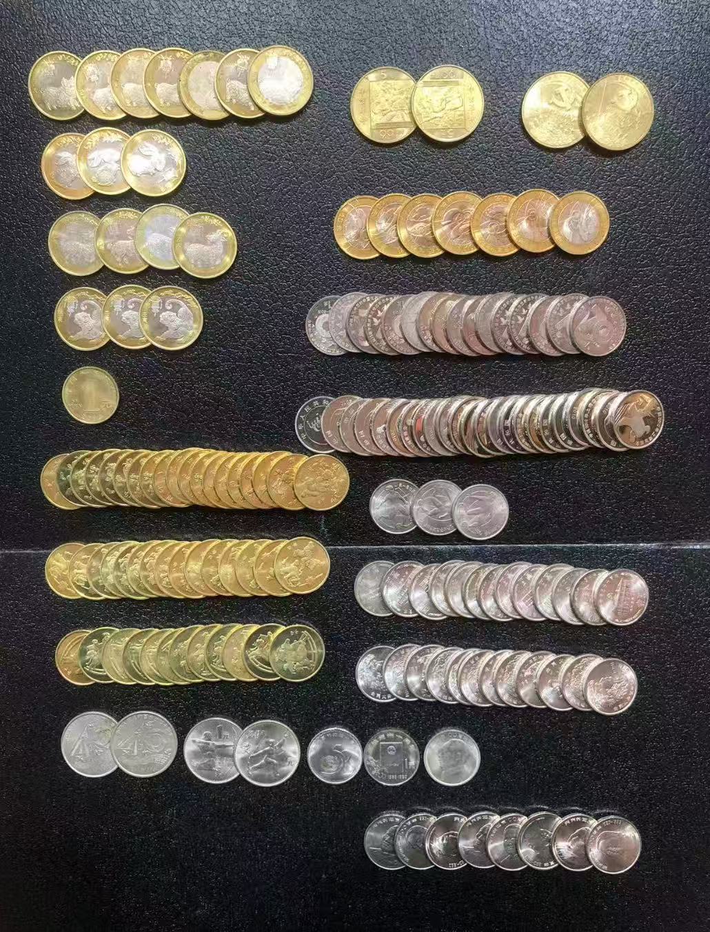 二猪7枚X10.5元。二兔3枚X14元。二羊4枚X25元。二虎3枚X15元。一羊1枚X80元。一龙19枚X4元。一蛇15枚X3元。一马12枚X4元。辛亥2枚X7元。建党五元2枚X6元。新世纪7枚X12元。抗战16枚X1.5元。世博23枚X2元。女足3枚X7元。建党壹圆13枚X6元。植树节12枚X6元。大40年2枚X25元。亚运会2枚X8元。联合国1枚X4元。宪法1枚X7元。毛1枚X32元。宋8枚X17元 总计1125元