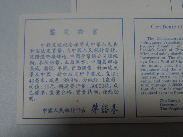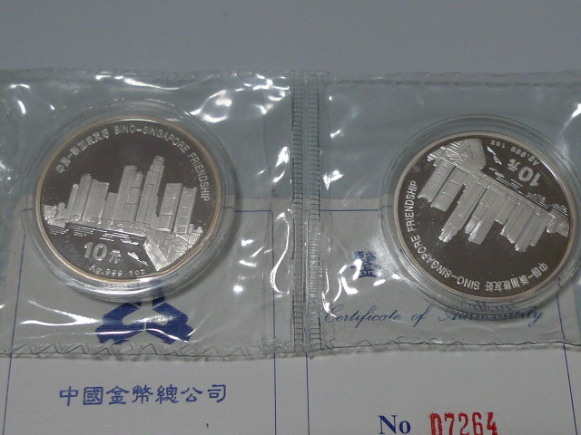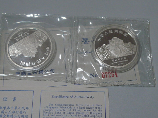 投资资讯网交易在线钱币大卖场现代金银贵金属币 → 出售老精希1994年中国--新加坡友好1盎司银币两枚。