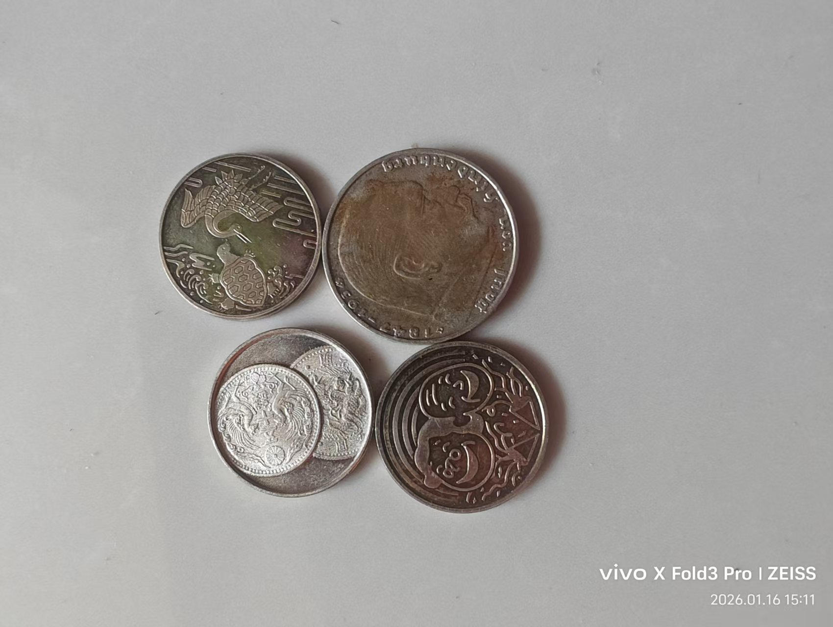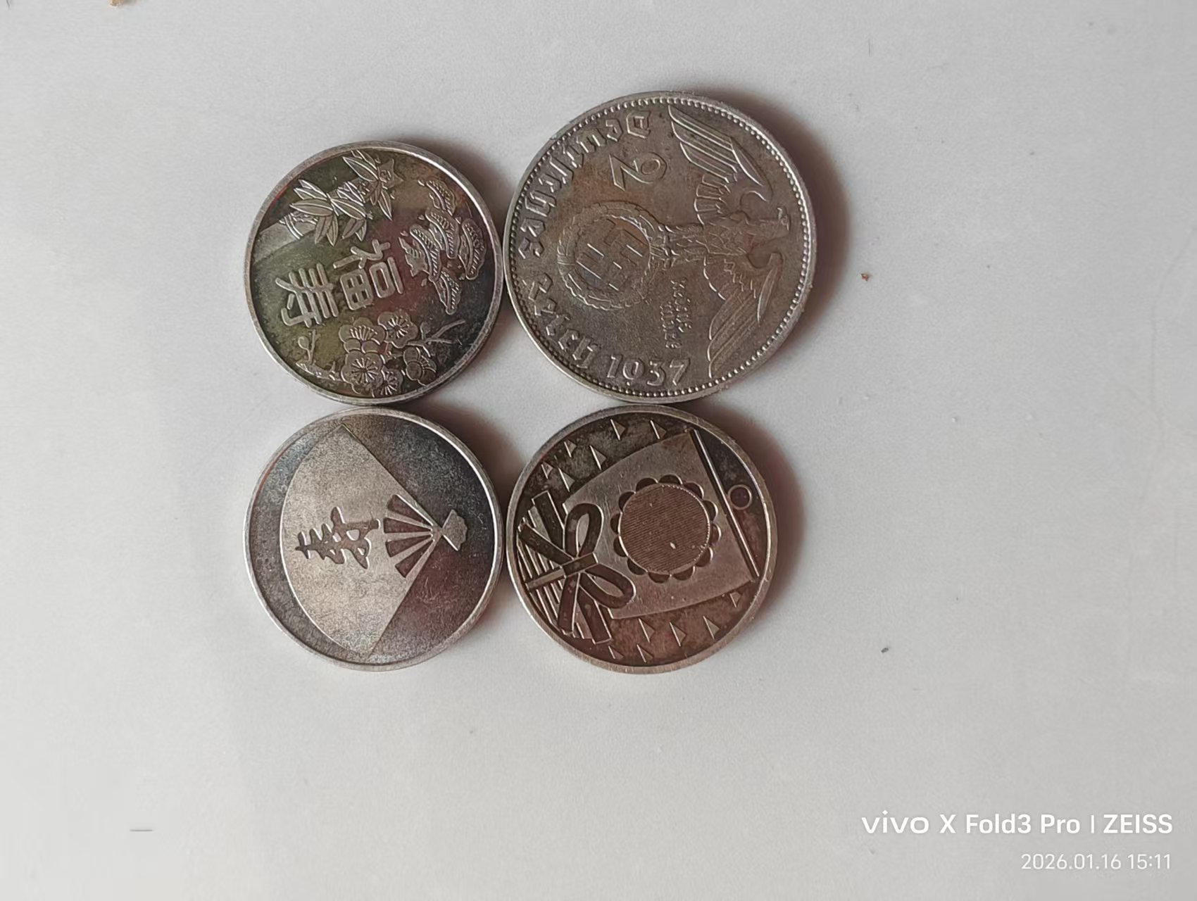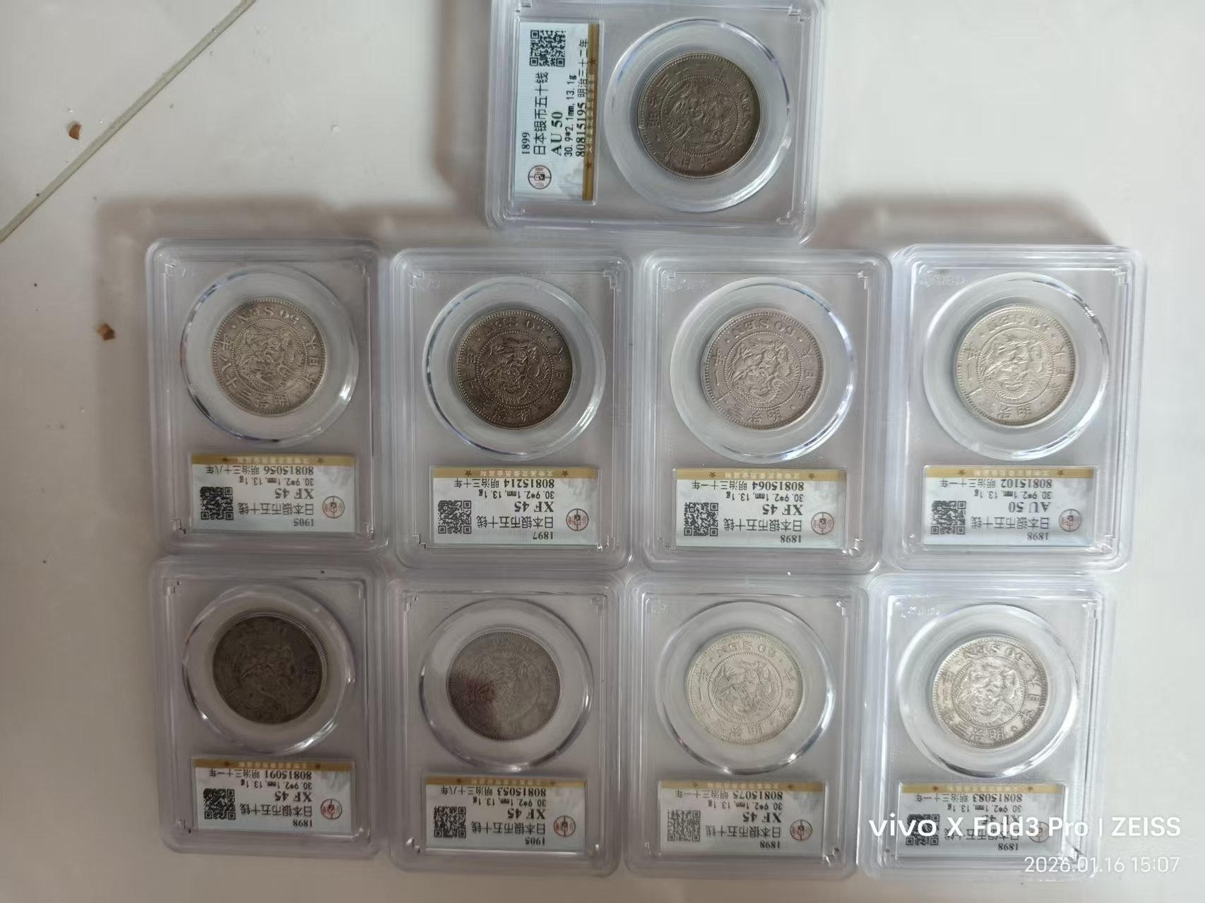日本龙50钱9枚x300元。50钱花4枚x260元。大奶妈400元一枚。鹰4x280.福寿日本银币3x120元。另一枚银币10克左右180元。三包到手