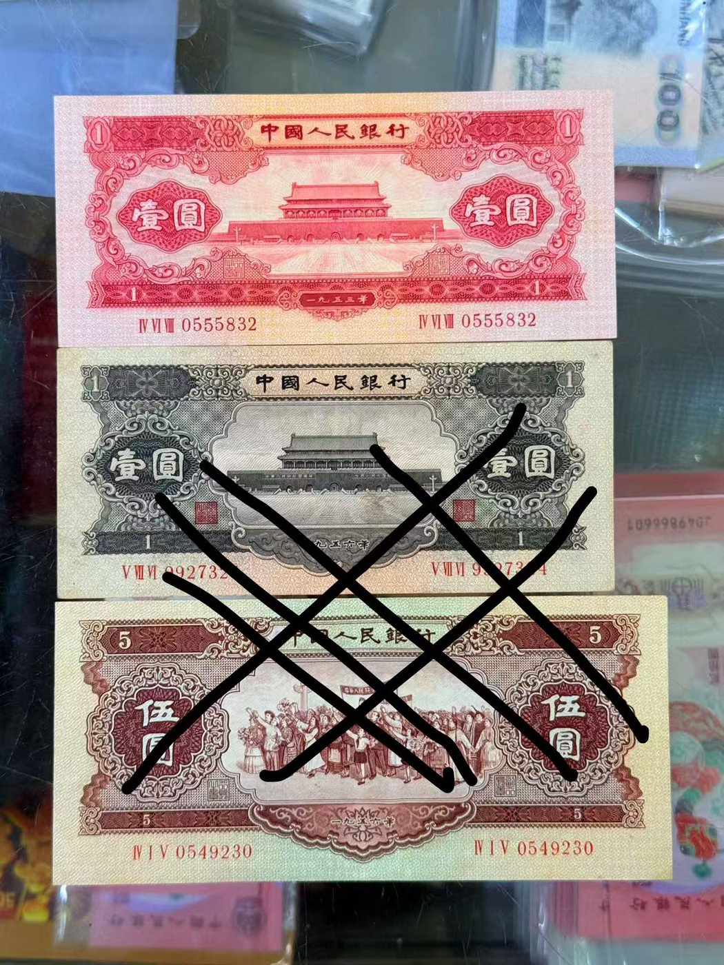 → 全新原票枣红一角 原票红一元 原票绿叁圆 !