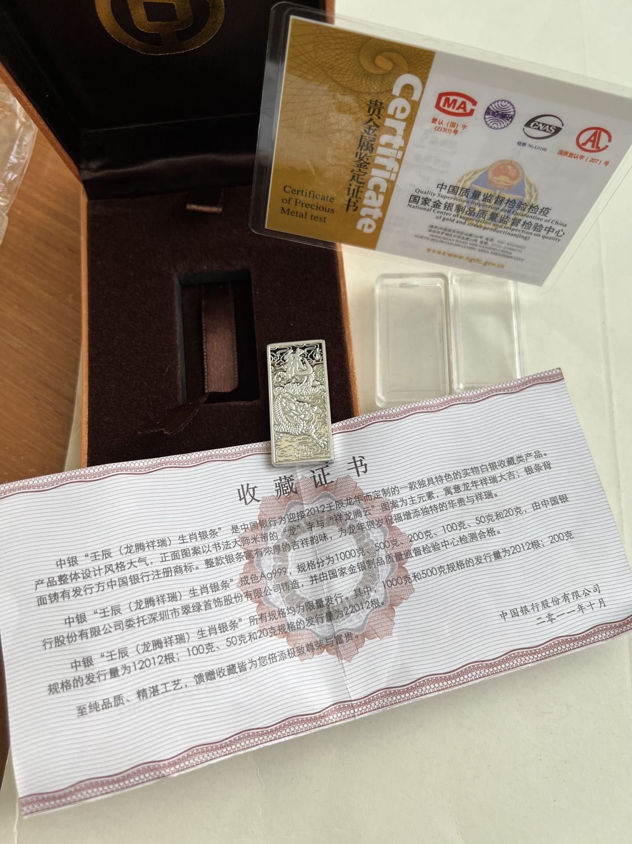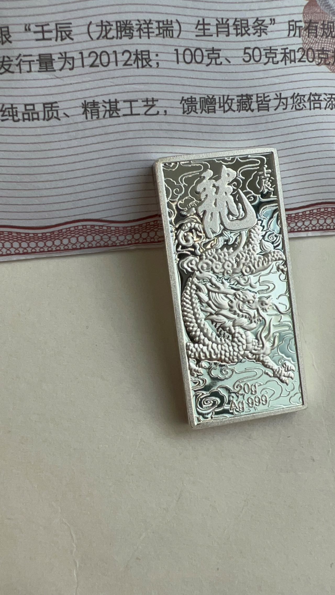 出中国银行20克生肖龙(2012)银条一根