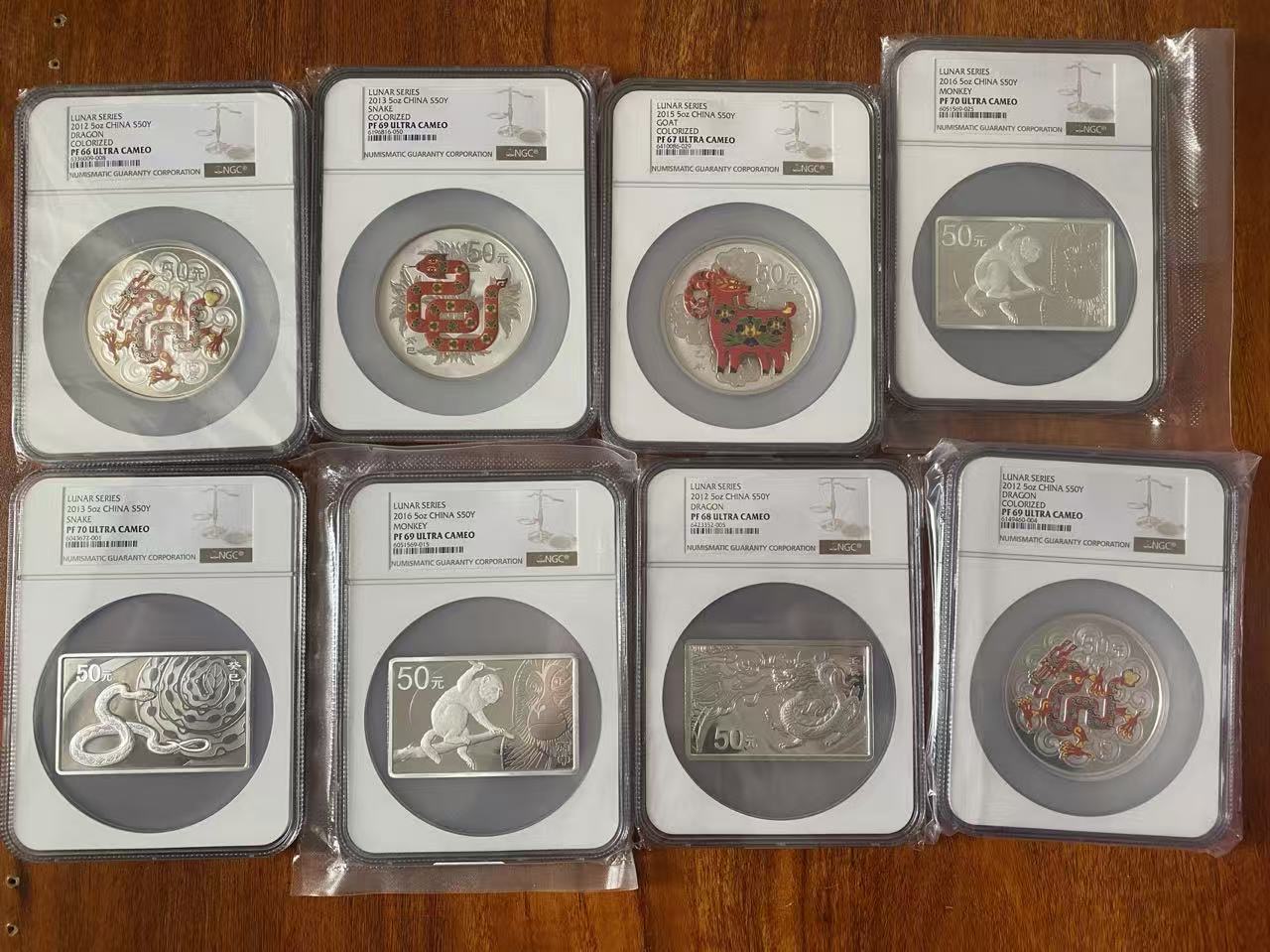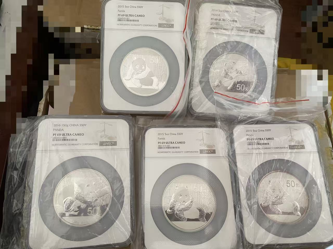 出几枚5盎司熊猫,生肖彩银,方银NGC评级币