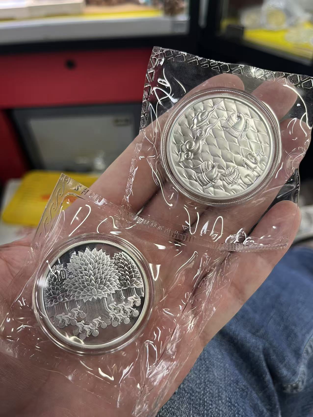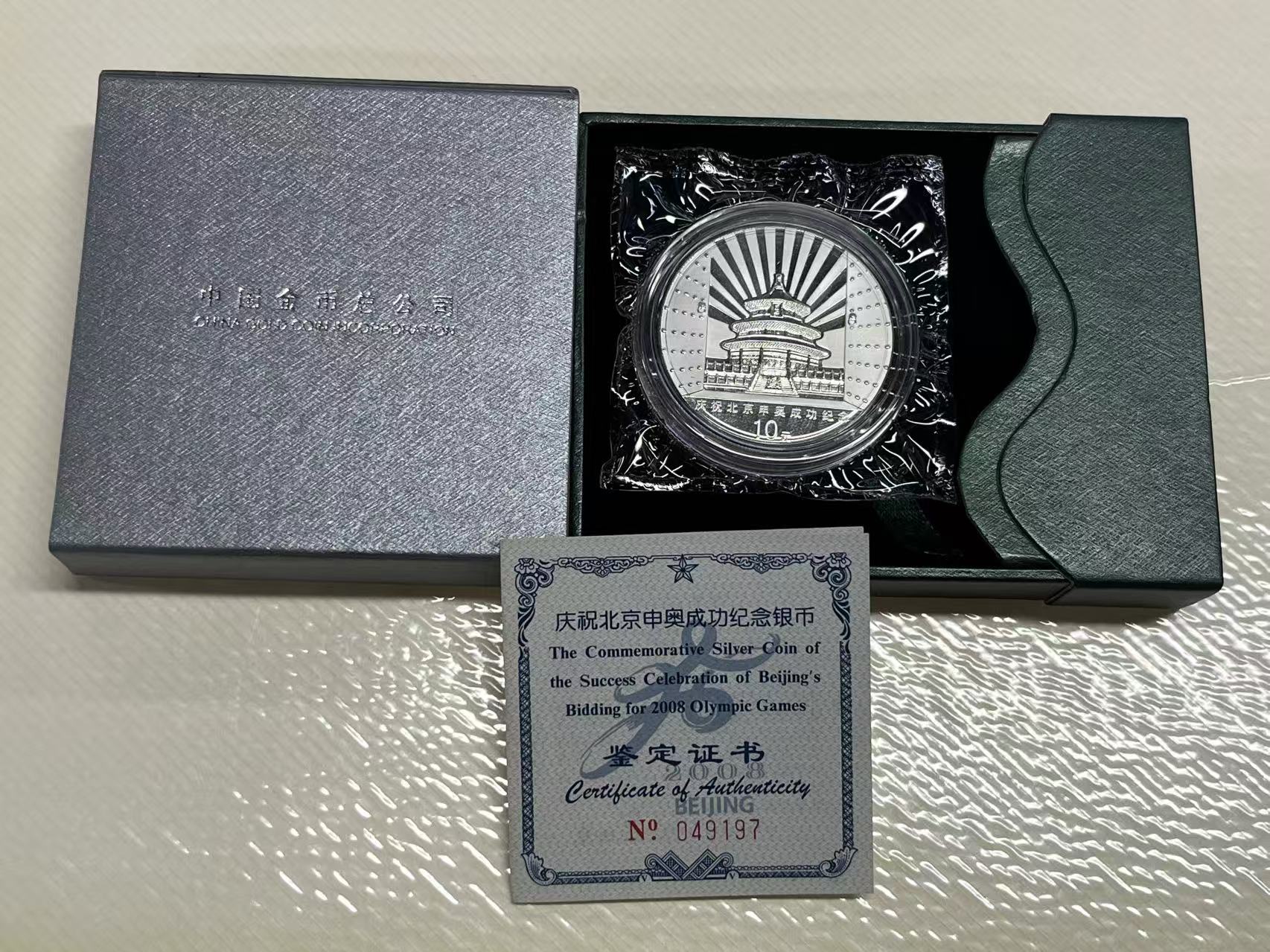 3、2008庆祝北京申奥成功纪念银币1盎司,盒证齐全原封全品卖1000元。