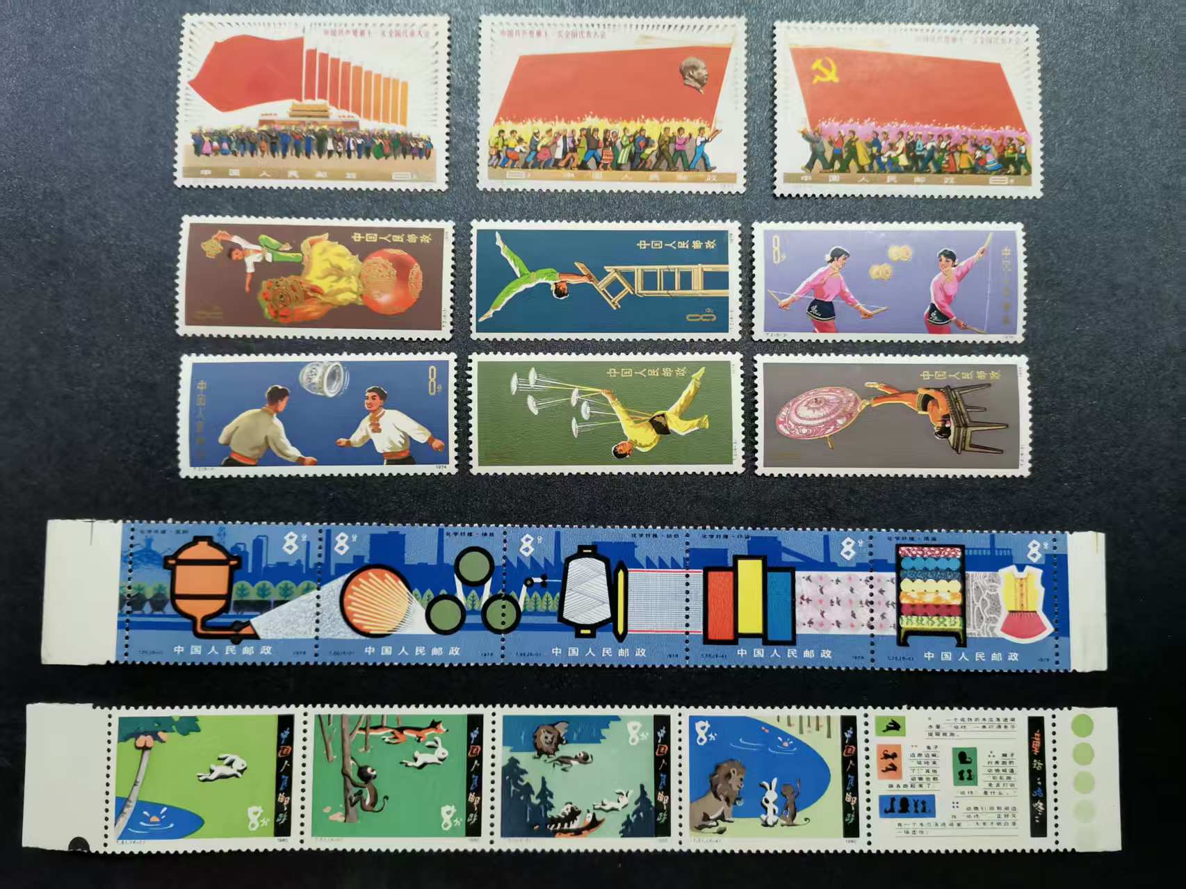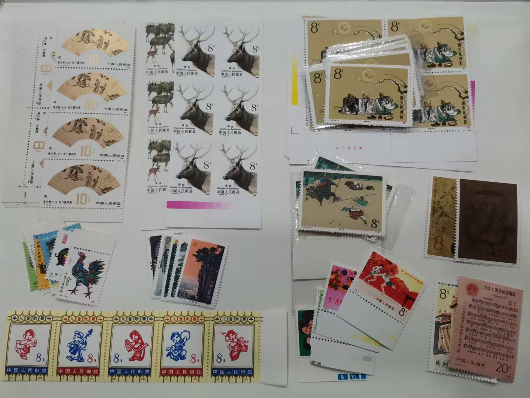 水浒一3套120元;三国一12套120元;乒二150元;帛画20元扇面金亮4连140元;六届人大23元;儿童歌舞齿孔折40元庐山75元;无齿麋鹿6连39元;生肖鸡--羊11全100元