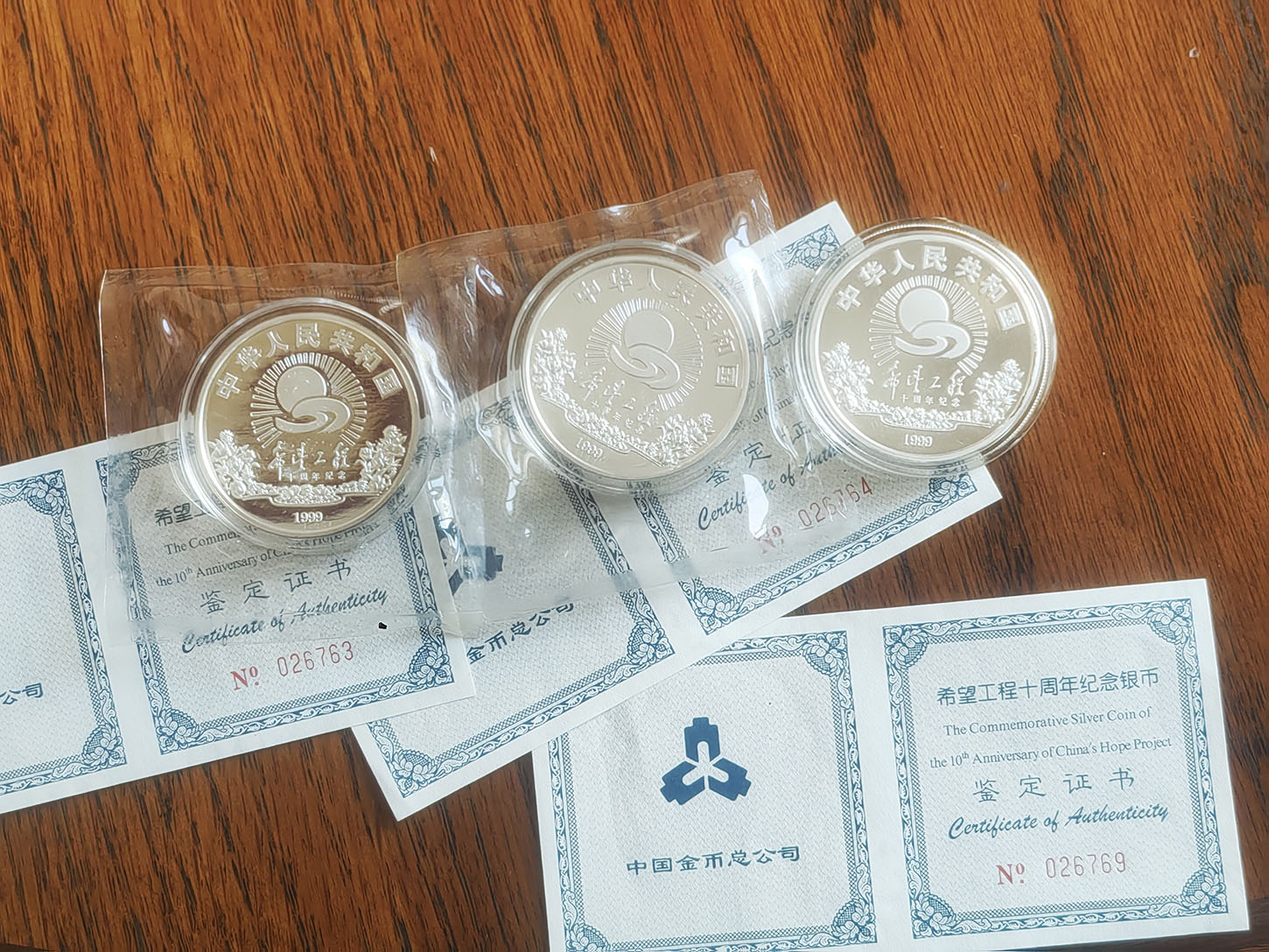 1999年发行希望工程十周年纪念银币,有证书无包装盒。售价每枚820元。共计3枚,不单出通走顺丰包邮