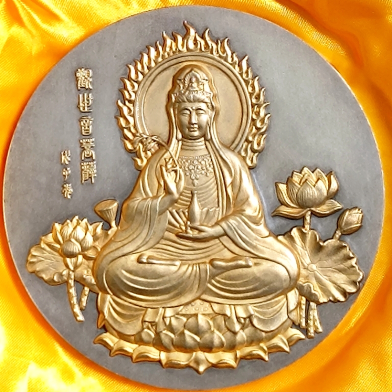 纯金观音1843.1克,发行量9枚。纯银观音1002.7克。量99枚。铜99枚,镏金619枚。正面观音坐莲,背面大慈大悲文字,工艺精湛,精美绝伦。加我微信18961751228.可看银章图,是上海造币厂2008年早期120mm的精品,市场罕见。售价:金章议价,银章3.8万元。铜章0.38万元,镏金章0.58万元。注:镏金不是镀金,镀金只有2-10微米,镏金厚度是其的5-10倍,观感是厚实的黄金。)