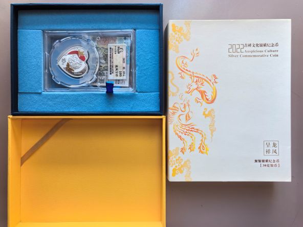 → 2022年龙凤呈祥30克心银国衡评级100分配金总原装封装盒