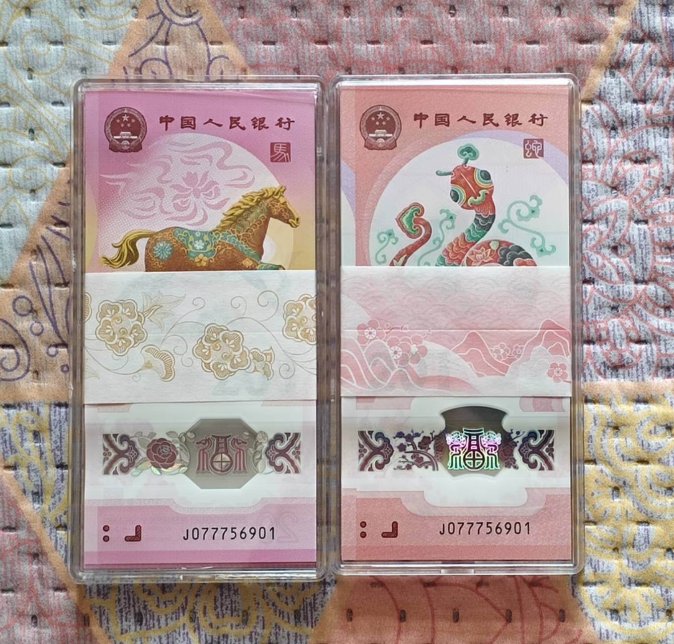马钞蛇钞全同号刀,马年 蛇年贺岁纪念钞J077756901-7000 百连 (飞马刀) 3W