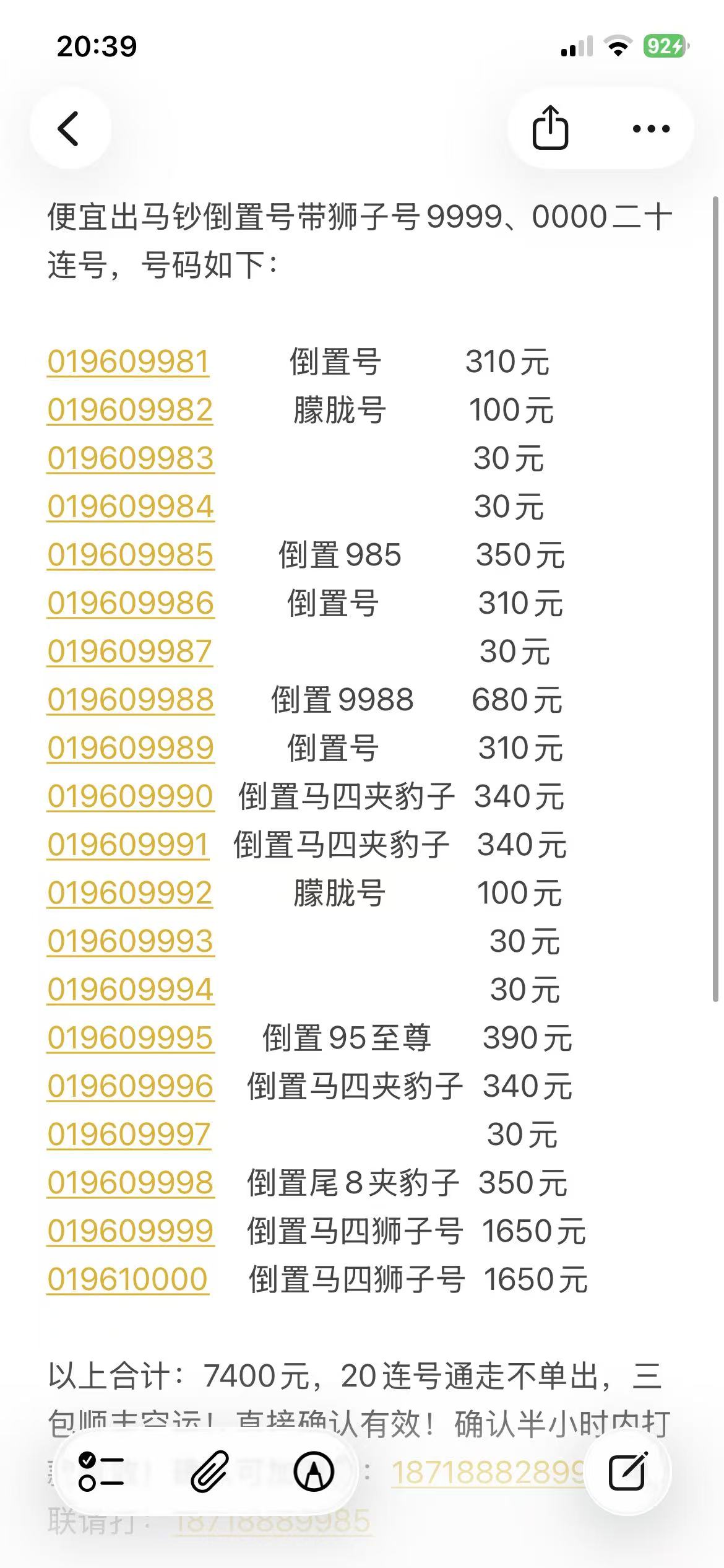 以上合计:7400元,20连号通走不单出,三包顺丰空运!直接确认有效!确认半小时内打款有效!