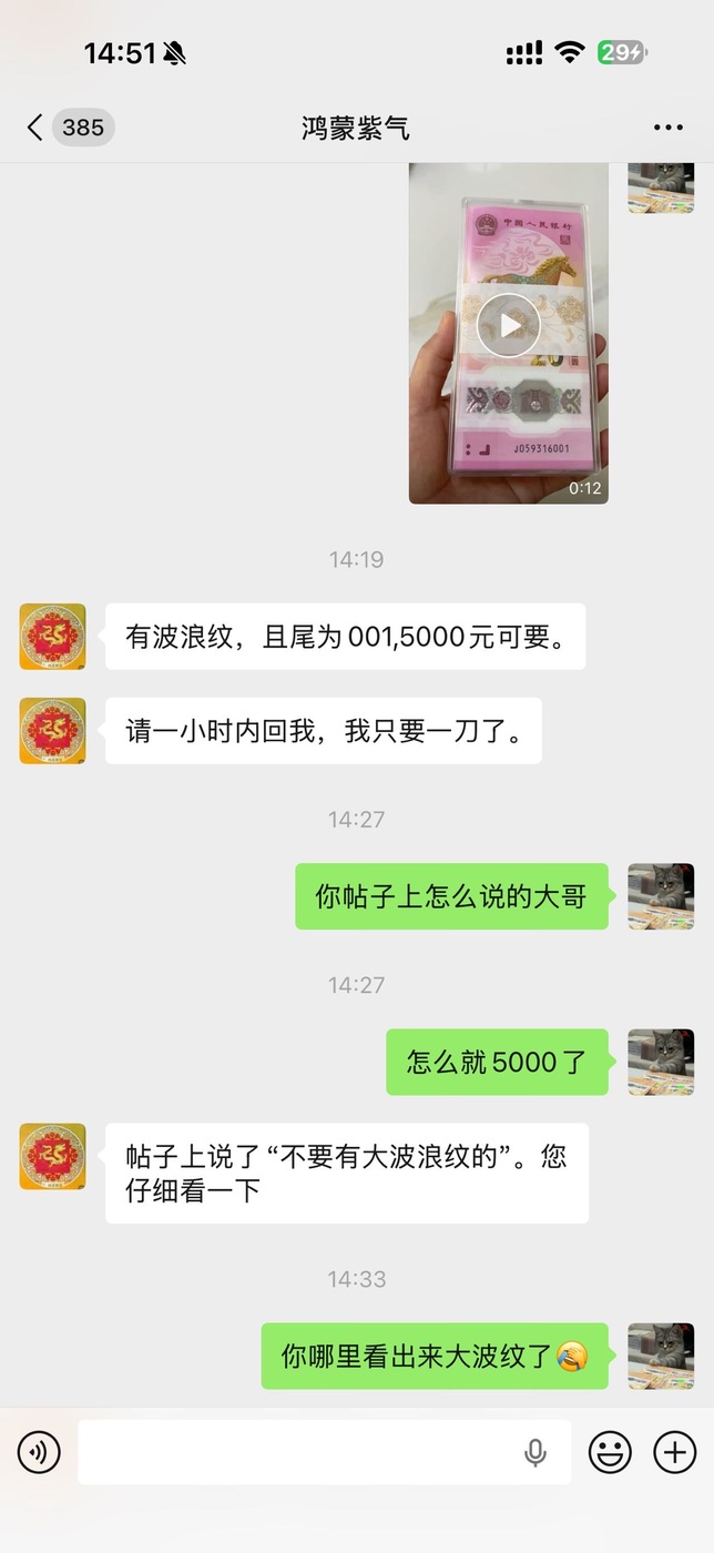 2、5200元/刀求马钞无47标刀 仅要1-2刀,(要求每组最后1张也是无47的,不要有大波浪纹的)
