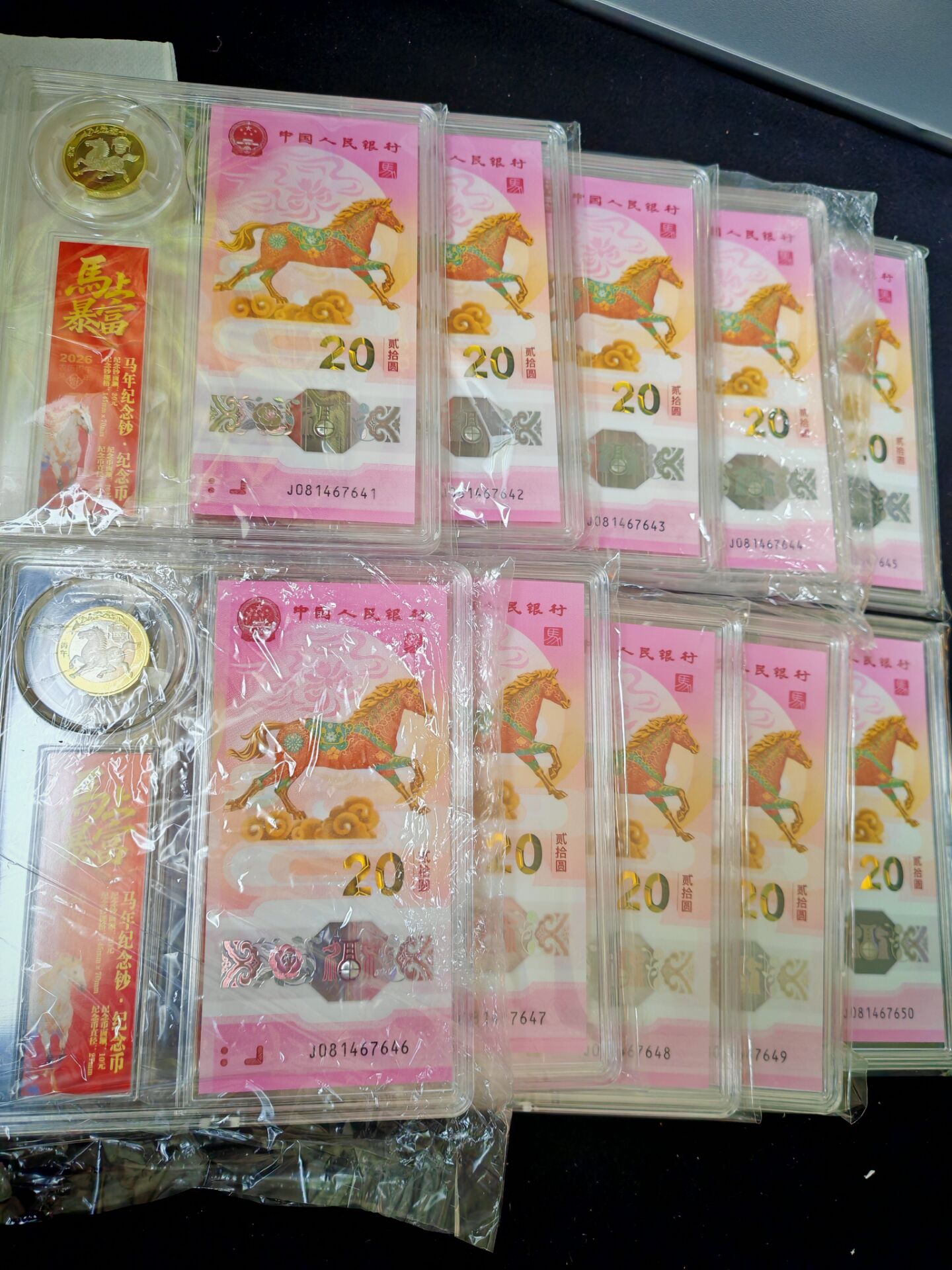 批发零售马上有钱、金马大吉、保真、品相如图、一币一钞带手提袋、批发价58元一套、零售88元一套包邮、实物比图片好很多、微信13833229040联系。