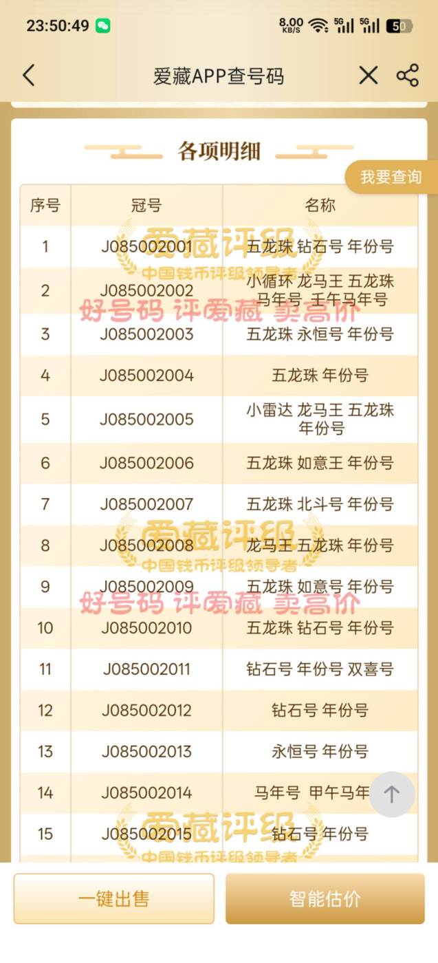 冠号版别:小雷达1张 小循环1张 龙马王4张 五龙珠11张 如意王1张 如意号1张 钻石号8张 永恒号2张 北斗号2张 年份号18张 马年号2张