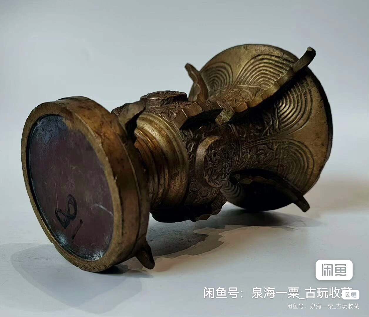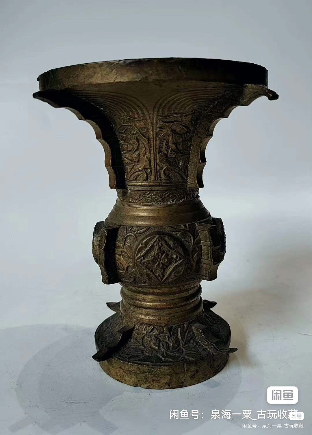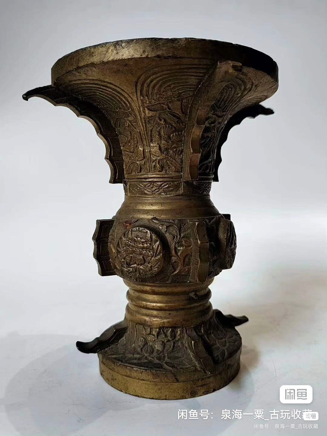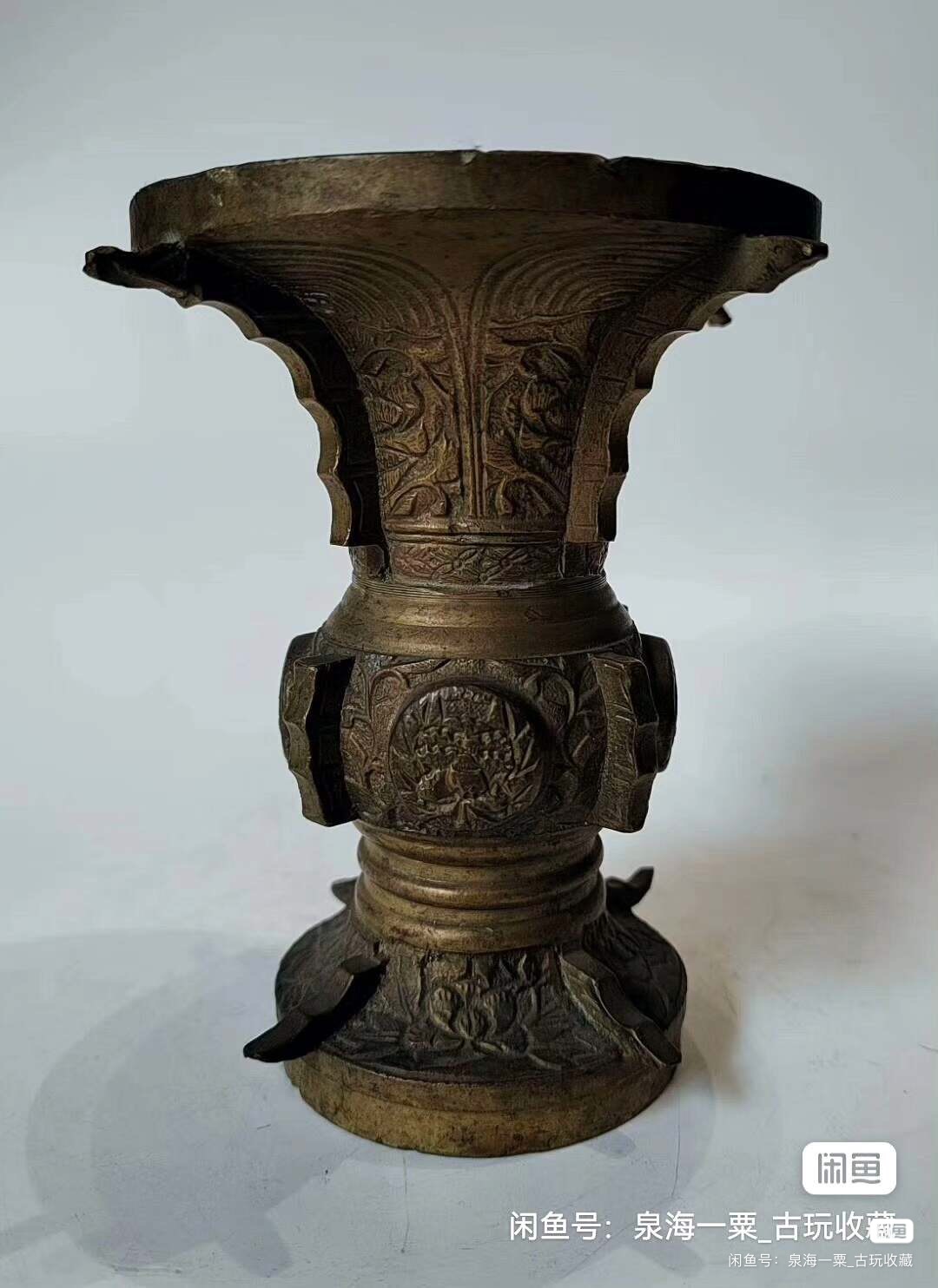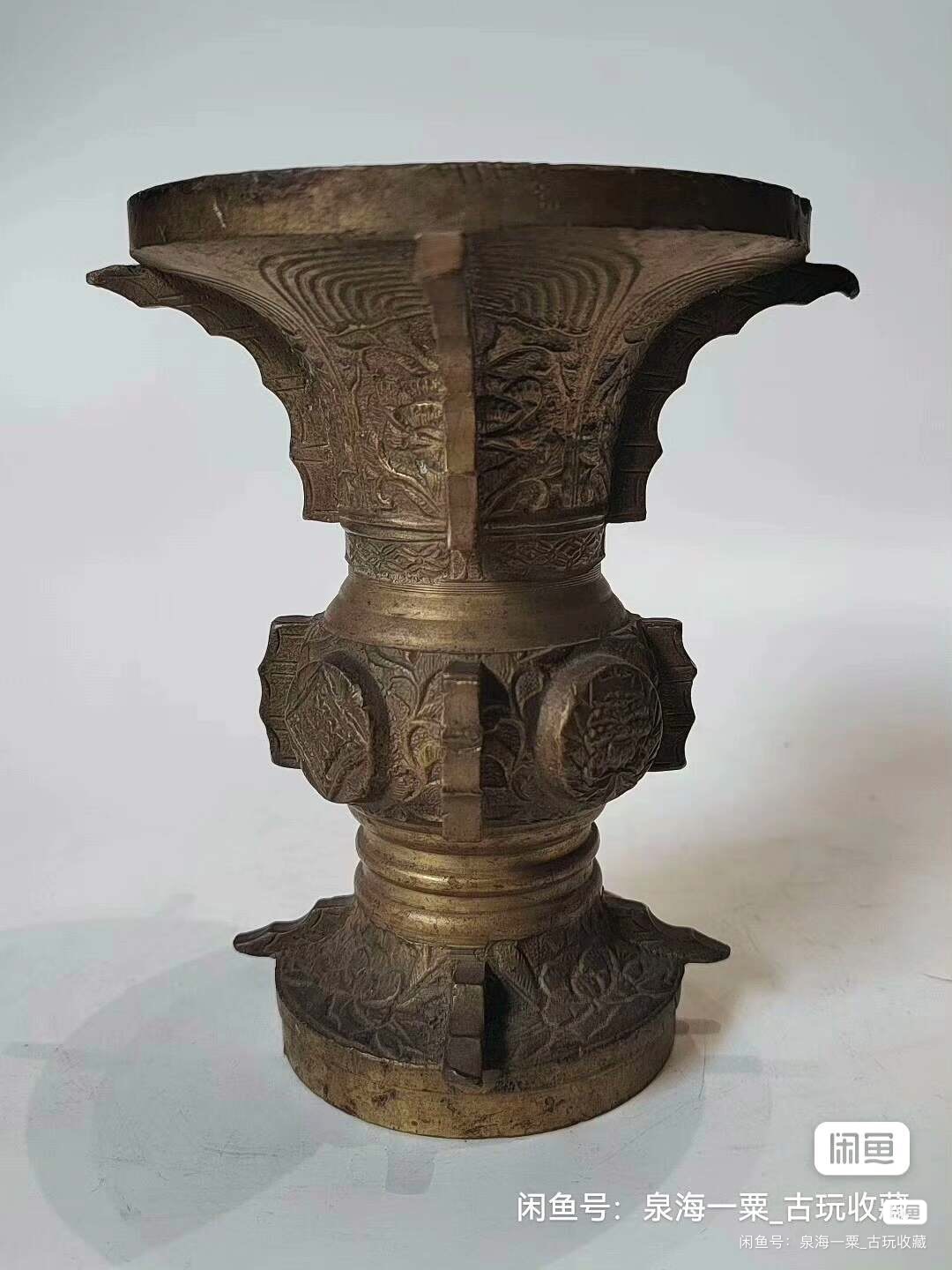 铜花觚,高11cm,重1.73斤。做工精致,满工雕刻,适合做摆件,插花。铜质厚重,包浆自然,