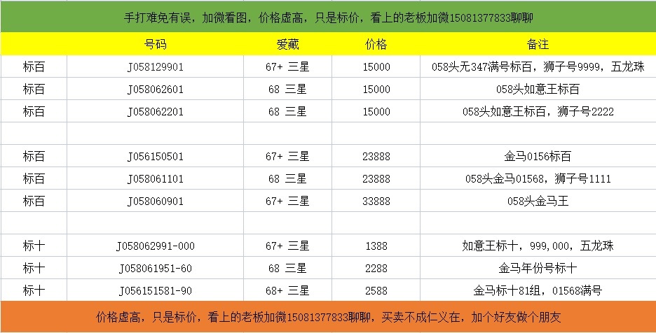 号码详细看图,手打难免有误,价格虚高,只是标价,看上的老板加微15081377833聊聊,买卖不成仁义在,加个好友做个朋友,