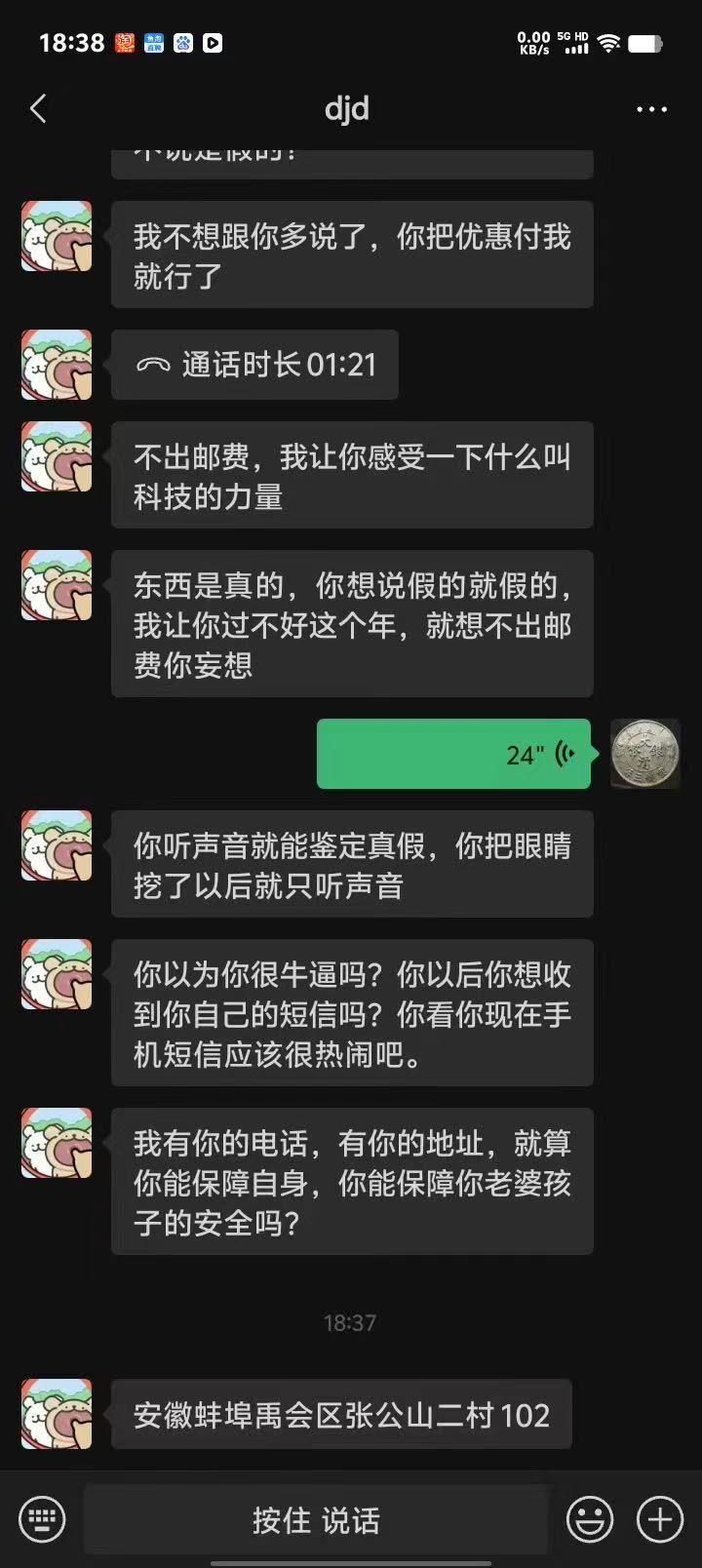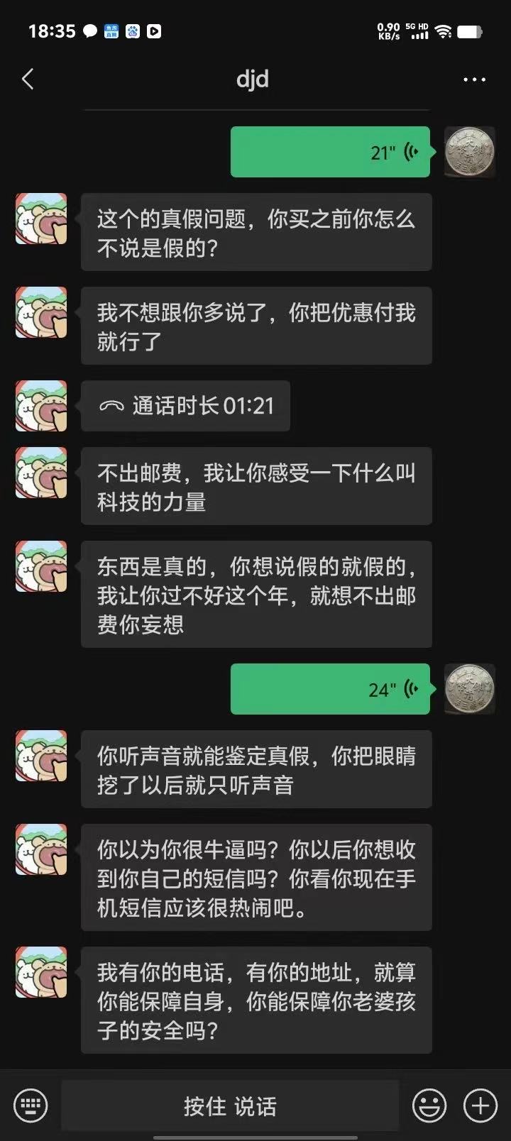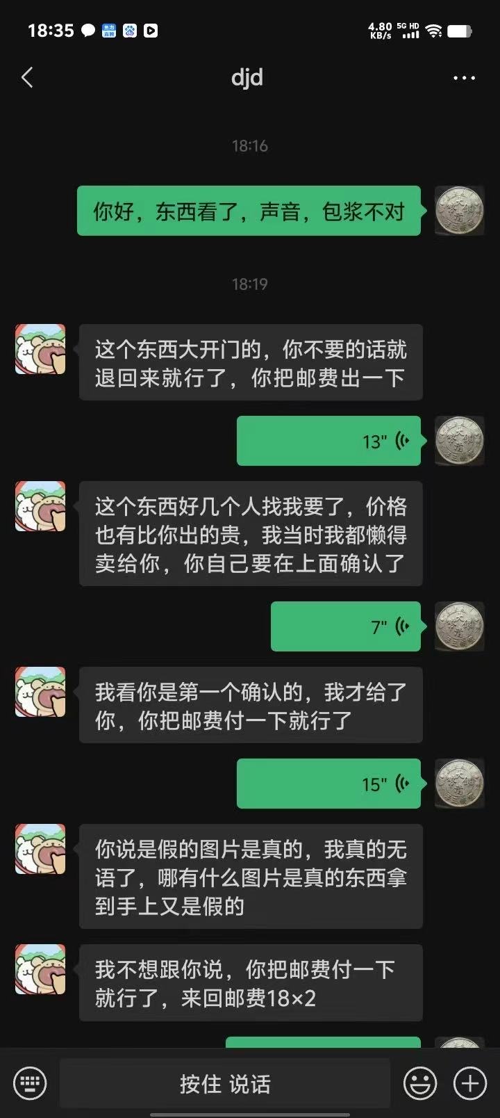 这是交易链接,卖家没有担保,又是新会员,选择顺丰代收款,收到货经过我和朋友的反复验证是一枚高*仿币,然后拒收,对方电话开始谩骂和恐吓,给我造成困扰,乱七八糟短信一直不停的发,建议一尘给予对方警告或封号处理,,