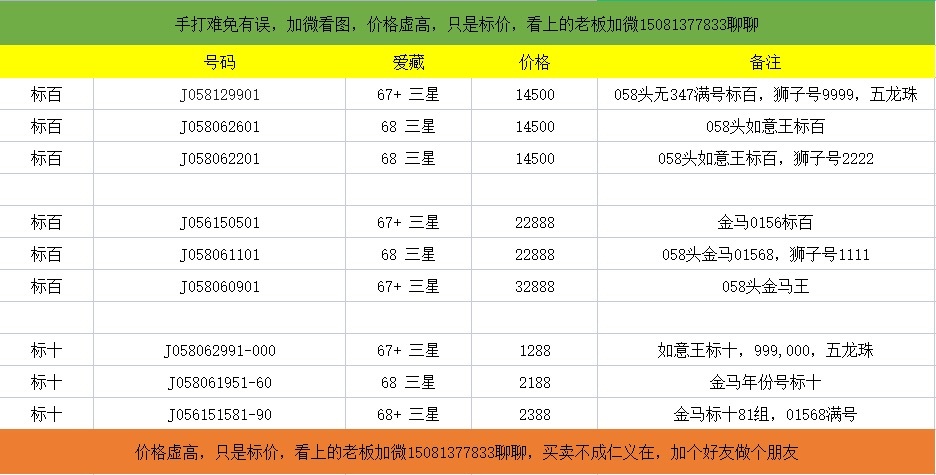 号码详细看图,手打难免有误,价格虚高,只是标价,看上的老板加微15081377833聊聊,买卖不成仁义在,加个好友做个朋友