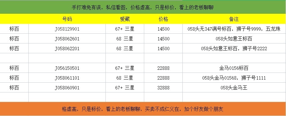 号码详细看图,手打难免有误,价格虚高,只是标价,看上的老板加微15081377833聊聊,买卖不成仁义在,加个好友做个朋友