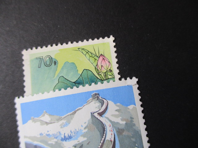荷花:70分右上一个小裂口,无胶一套100元。长城60分:右上裂口20元。