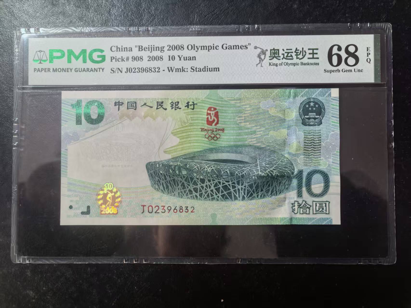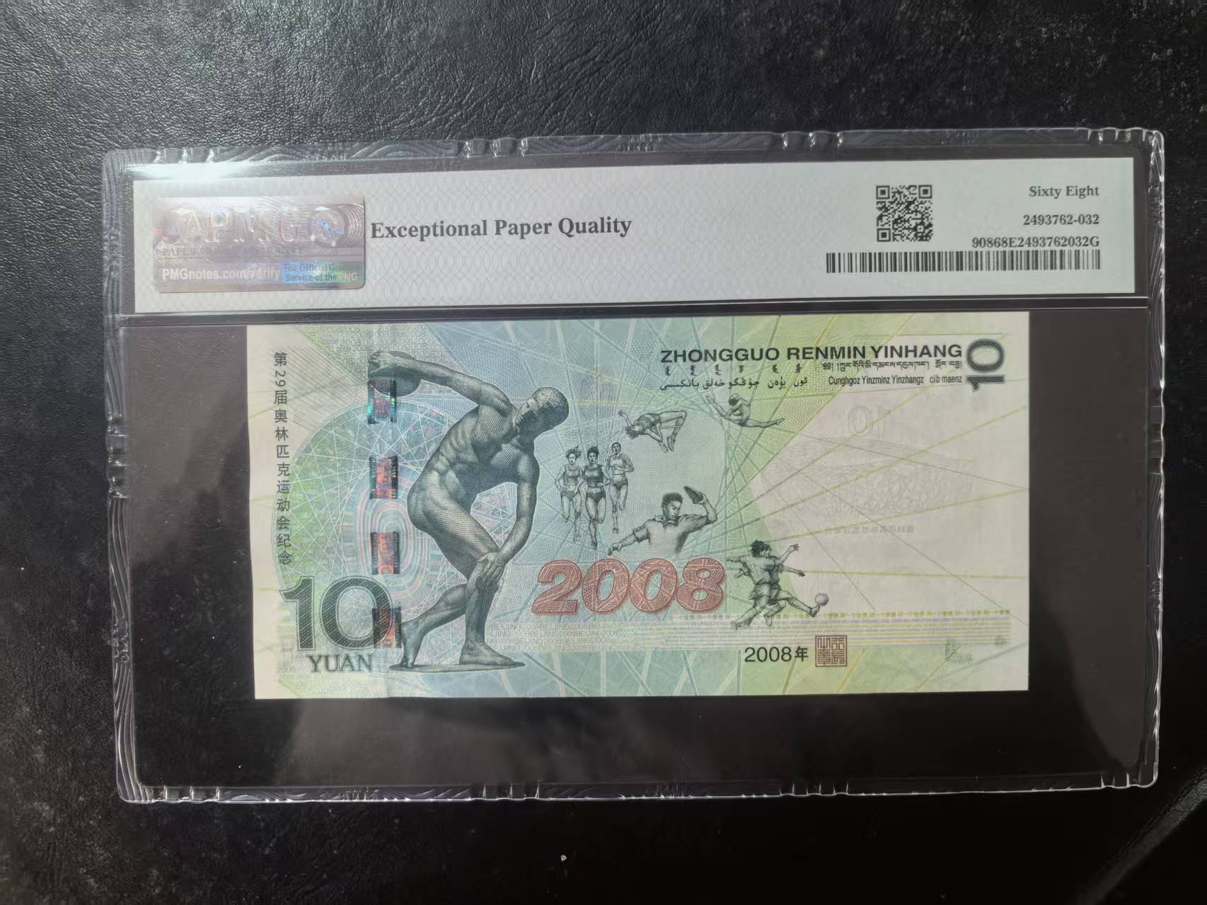奥运钞王中文标美评PMG68E无47,状态优秀,四角尖尖,票面干净,售价3650包顺丰