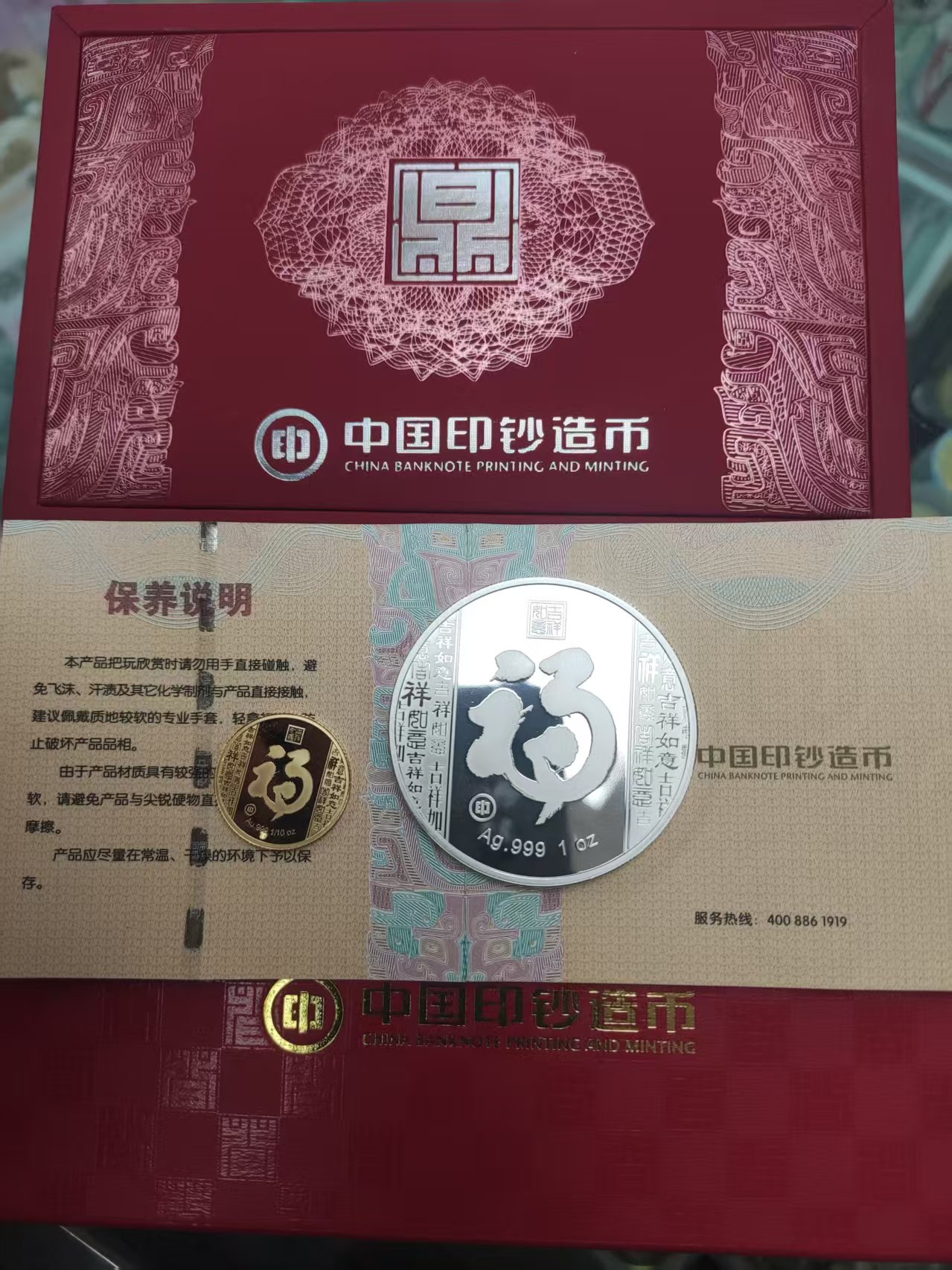 如图,15年生肖羊金银章1套,1/10盎司金+1盎司银,好品,售4200元