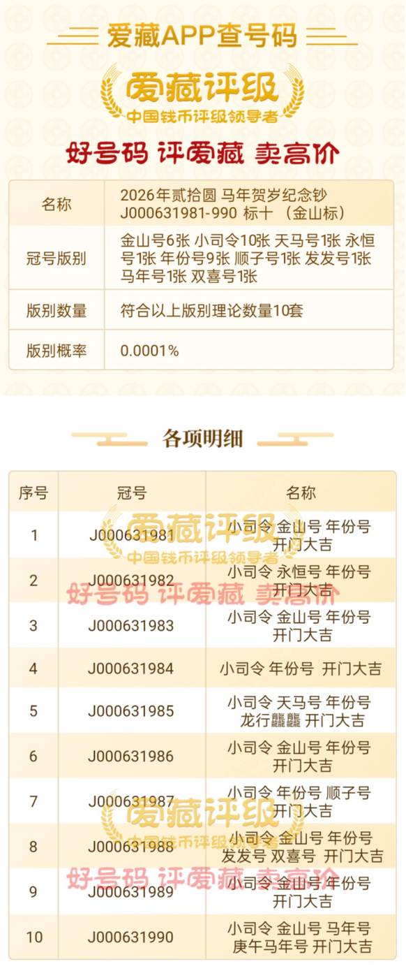 冠号版别:开门大吉10张 小司令10张 金山6张 天马号1张 年份9张 马年号1张 庚午马年号1张 龙行龘龘1张