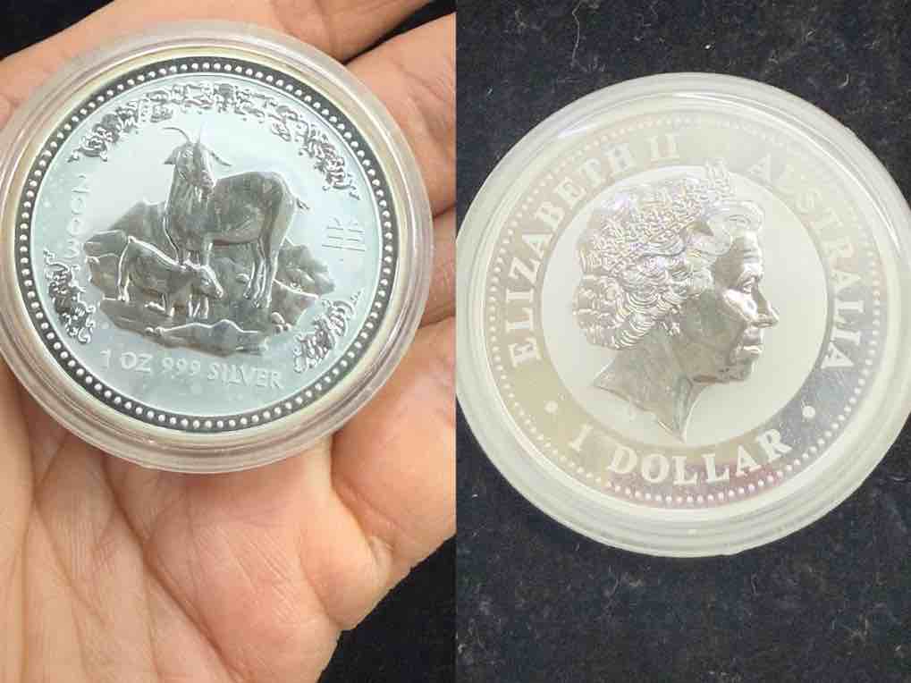 → ///////////少有2003年澳洲生肖羊银币,1盎司999纯银,面值1元
