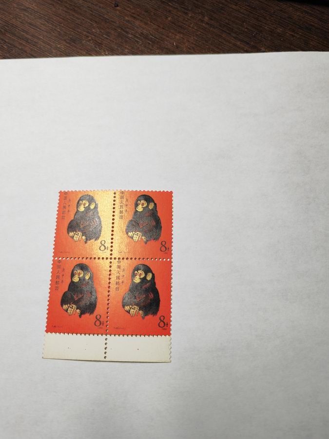 带边猴方联一个:如图,原胶,金亮,背面与白纸对比有点黄,背面中间齿左边1.2有点折,背面荧光灯下有斑,要求过荧光灯的勿确认,价:14800,三包顺丰.