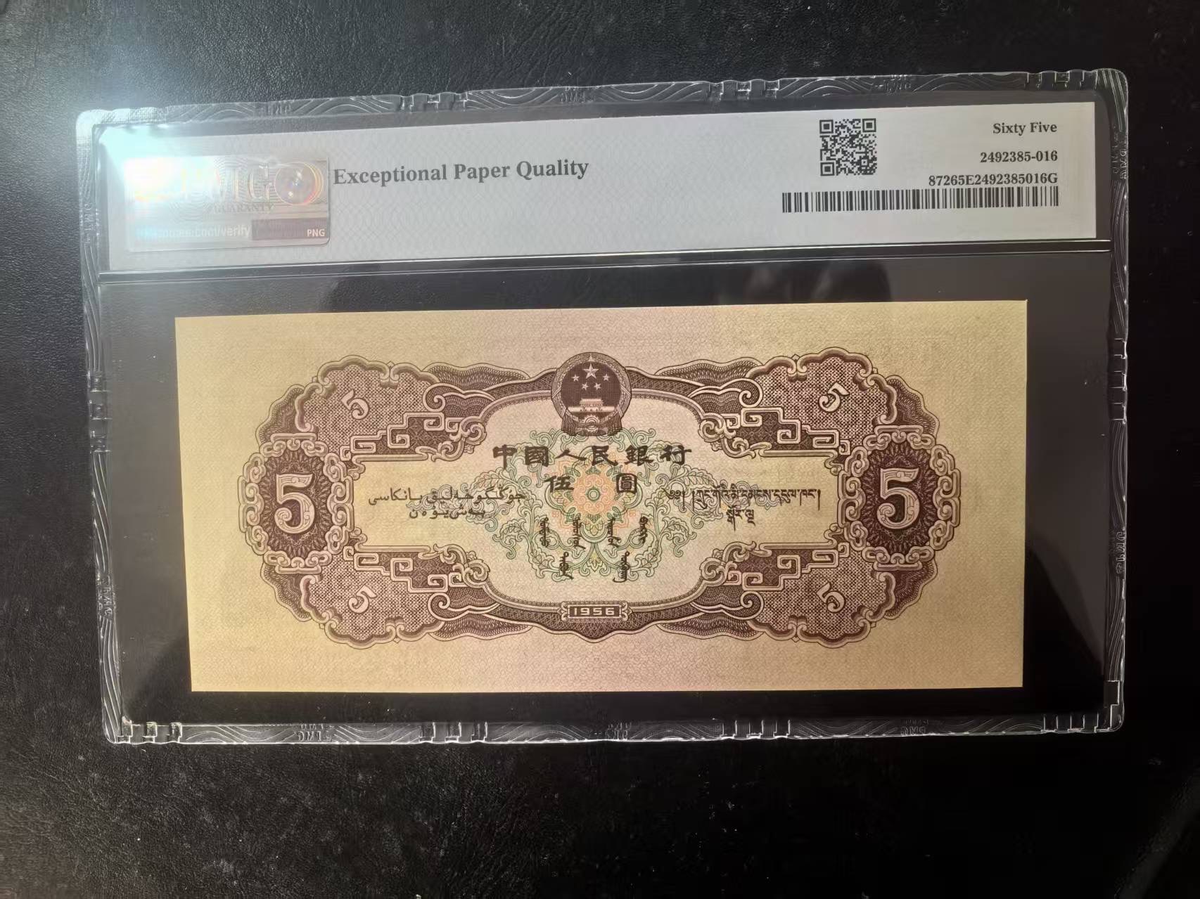 二版黄5元美评PMG65E,凹凸感明显,颜色鲜艳,水印清晰,售价2550包顺丰