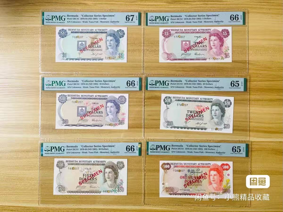 【1】百慕大1978年版女王头像样钞,女王端庄典雅,这套钞整体十分精美,值得收藏,目前见到的配齐整套非常稀少。百慕大纸钞在外国钱币收藏中地位很高,目前仍处于价值低估阶段,出货的越来越少,随着时间推移,必定会被更多的收藏者青睐。本套PMG权威评级,保真免鉴定,个人收藏,仅此一套,售价4400元;