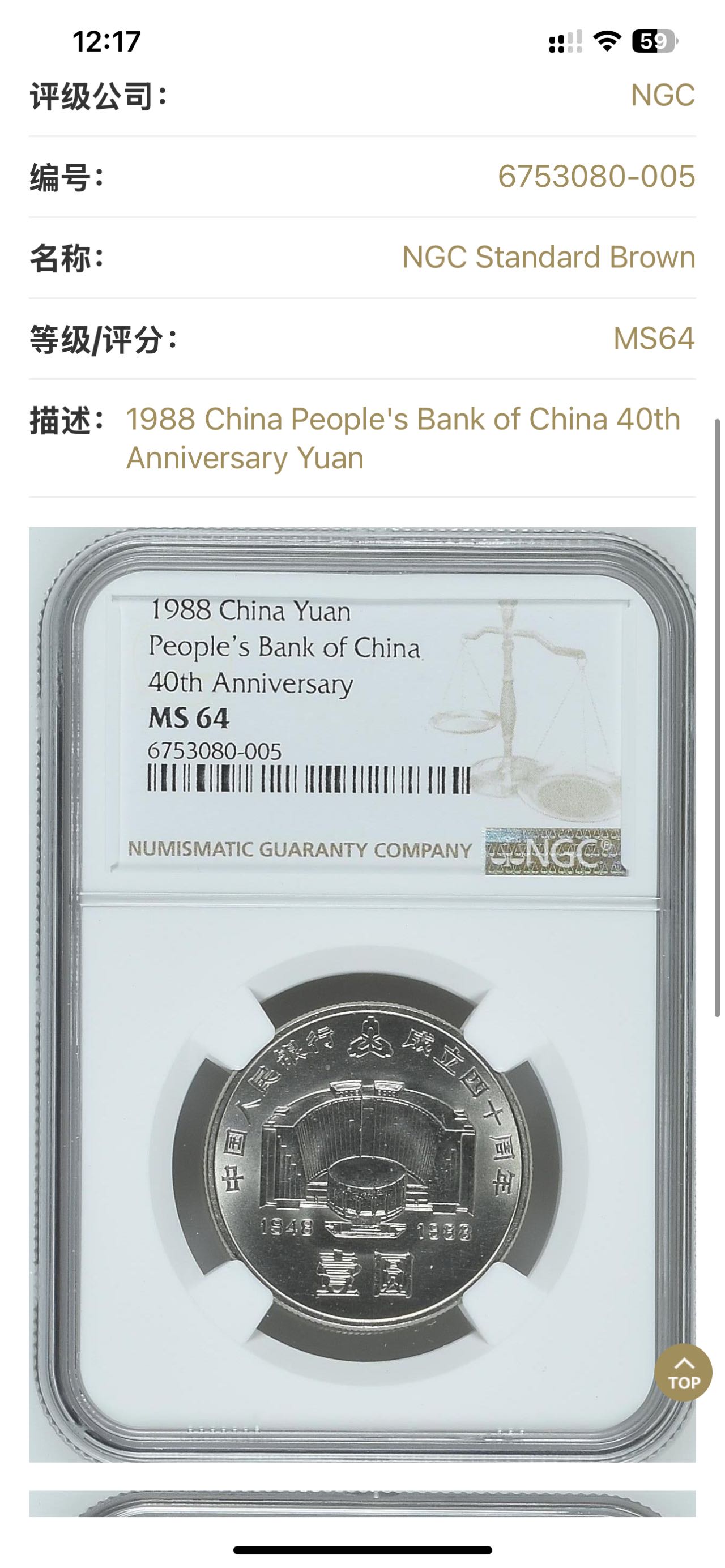 ★1780元出 美国NGC64分 原光1988年 币王建行