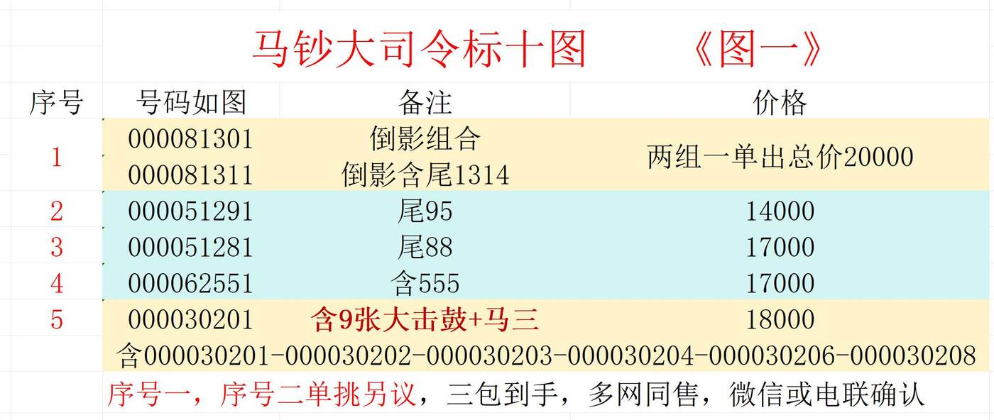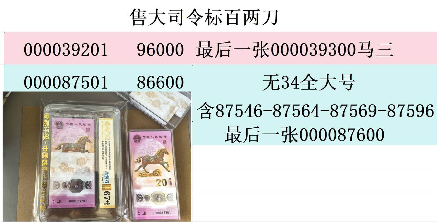 → 售《马钞大司令》几组标十和标百两刀,号码如图