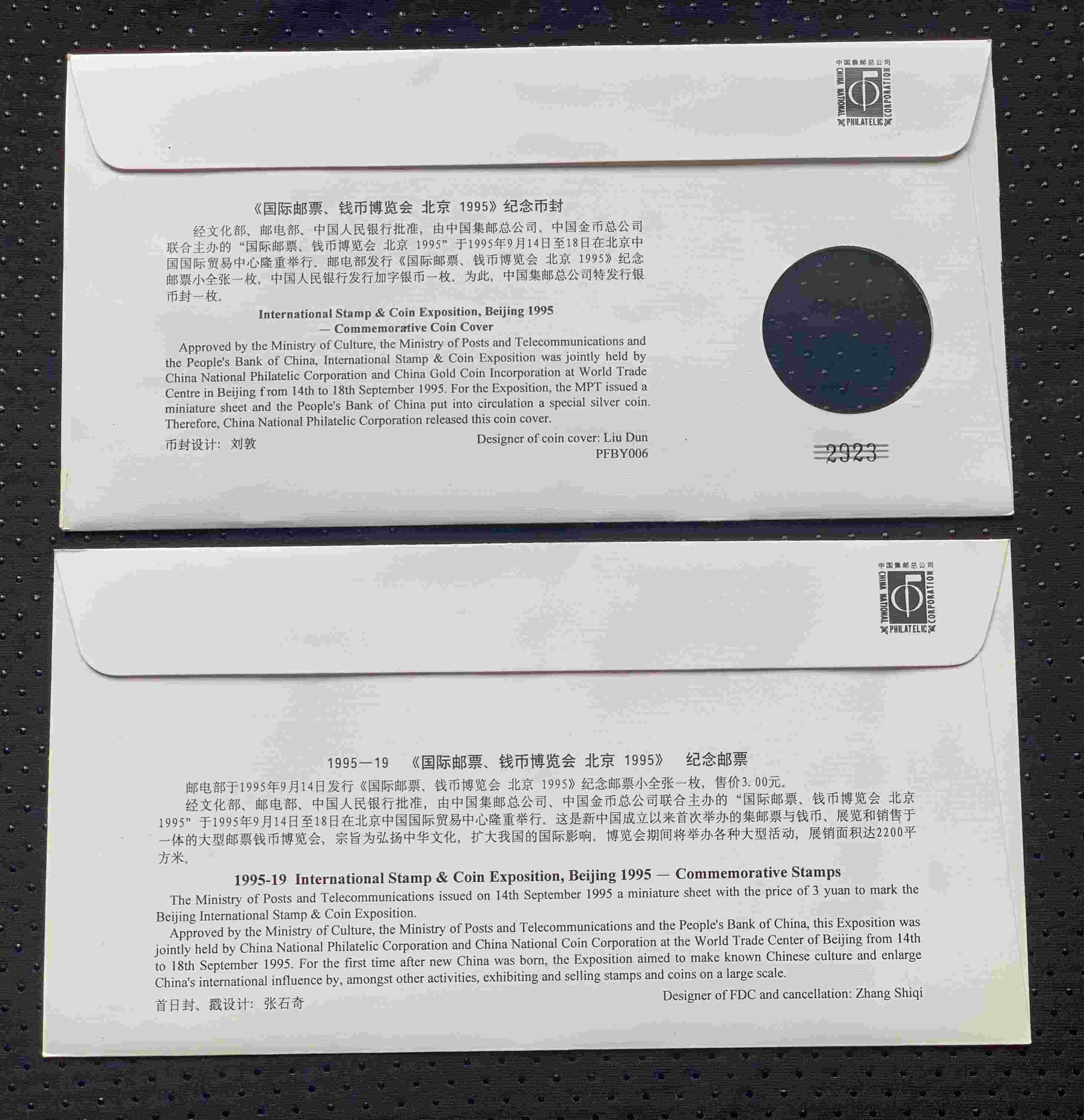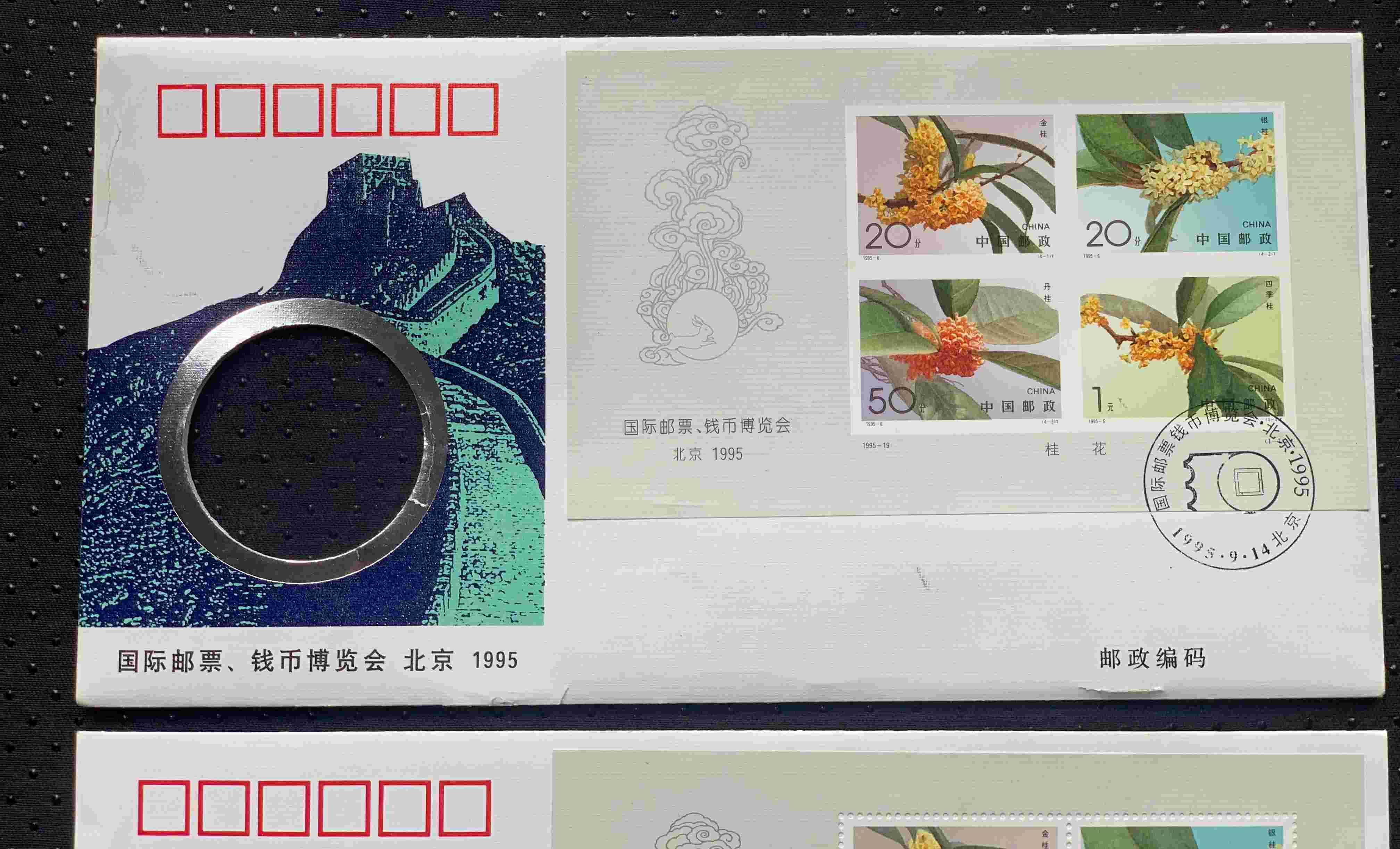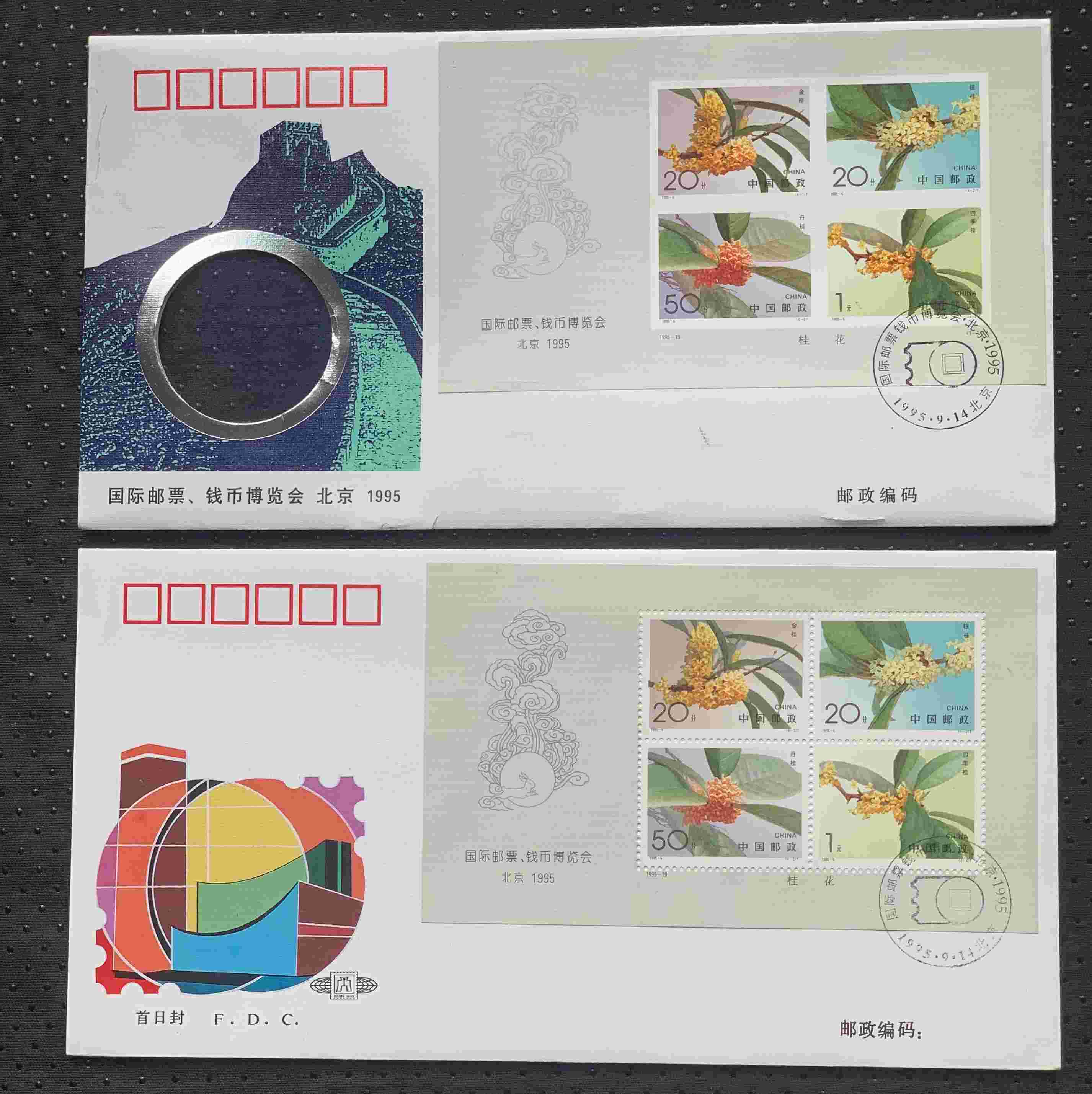 1995【国际邮票 钱币博览会 北京】无齿、有齿小全张首日封各一枚