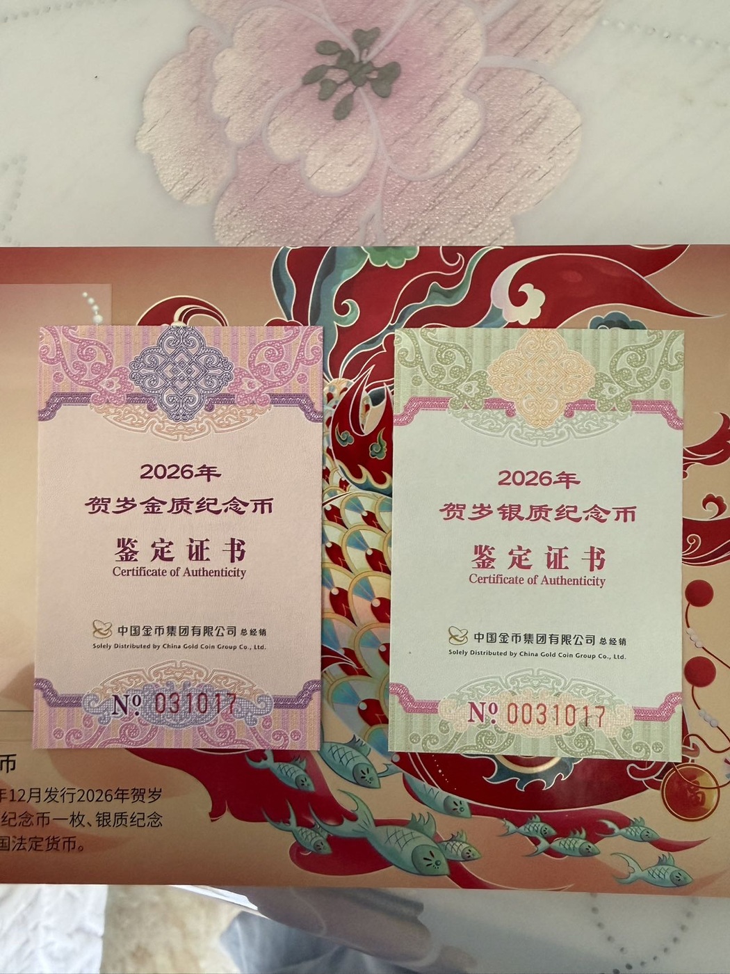 出售2026年贺岁金银福币,证书031017,1495元/套,包邮,确认前请先联系。 谢谢。