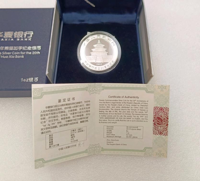2012年1盎司华夏银行加字熊猫银币1枚,带原盒证书,价格850元