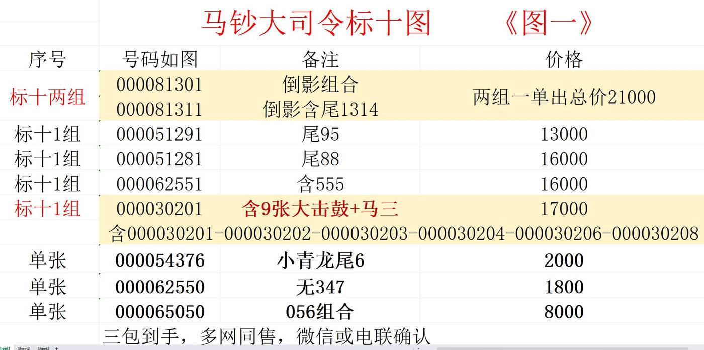 → 售 马钞大司令标十单张