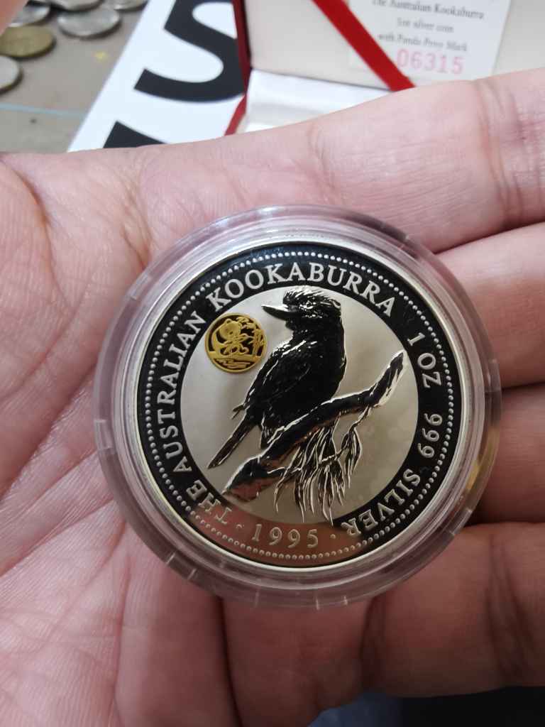 1995年澳大利亚笑翠鸟1盎司银币 镶纯金熊猫印记 1盎司纯银+0.5克纯金 ,如图,1600包邮