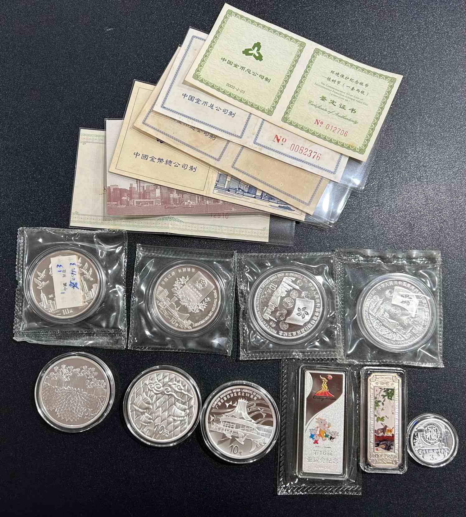 香港回归一二三组各一枚,三组有精制和普制;植树节一套两枚;广西一枚;银条20克10克各一条,福字币1枚(火烧过)