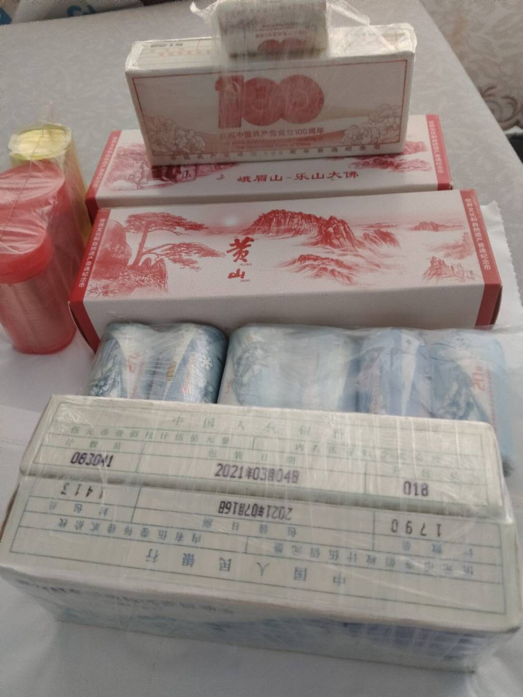 黄山峨眉山1对盒加1对卷,冬奥一对盒加3对卷,建党1盒加1卷