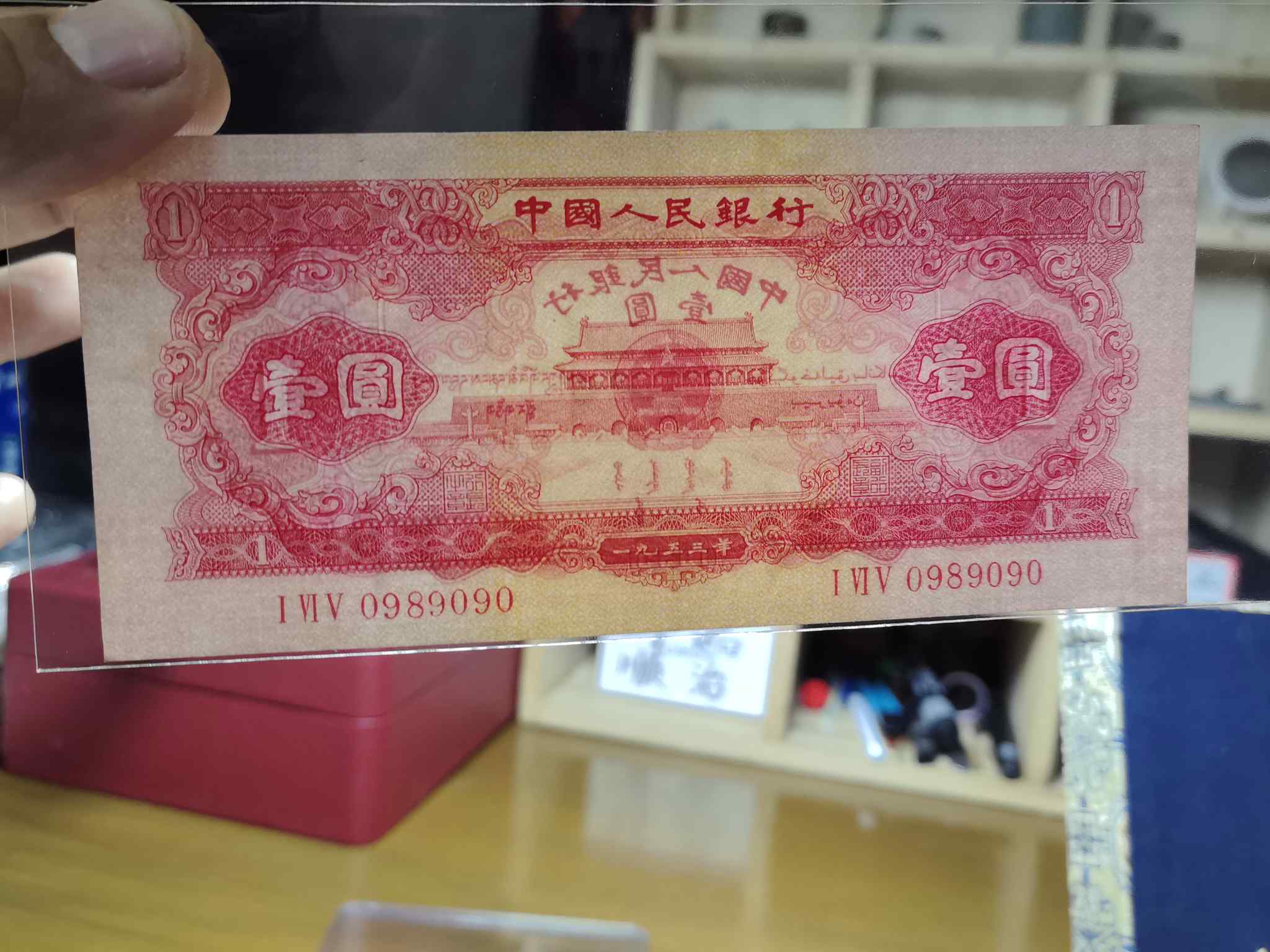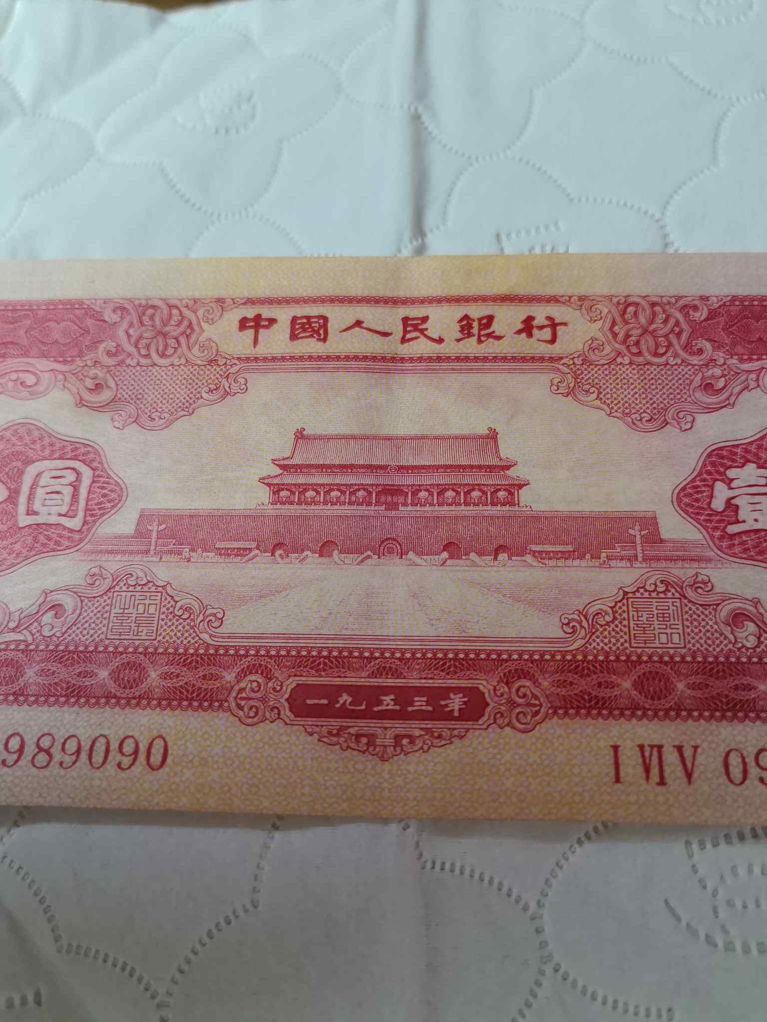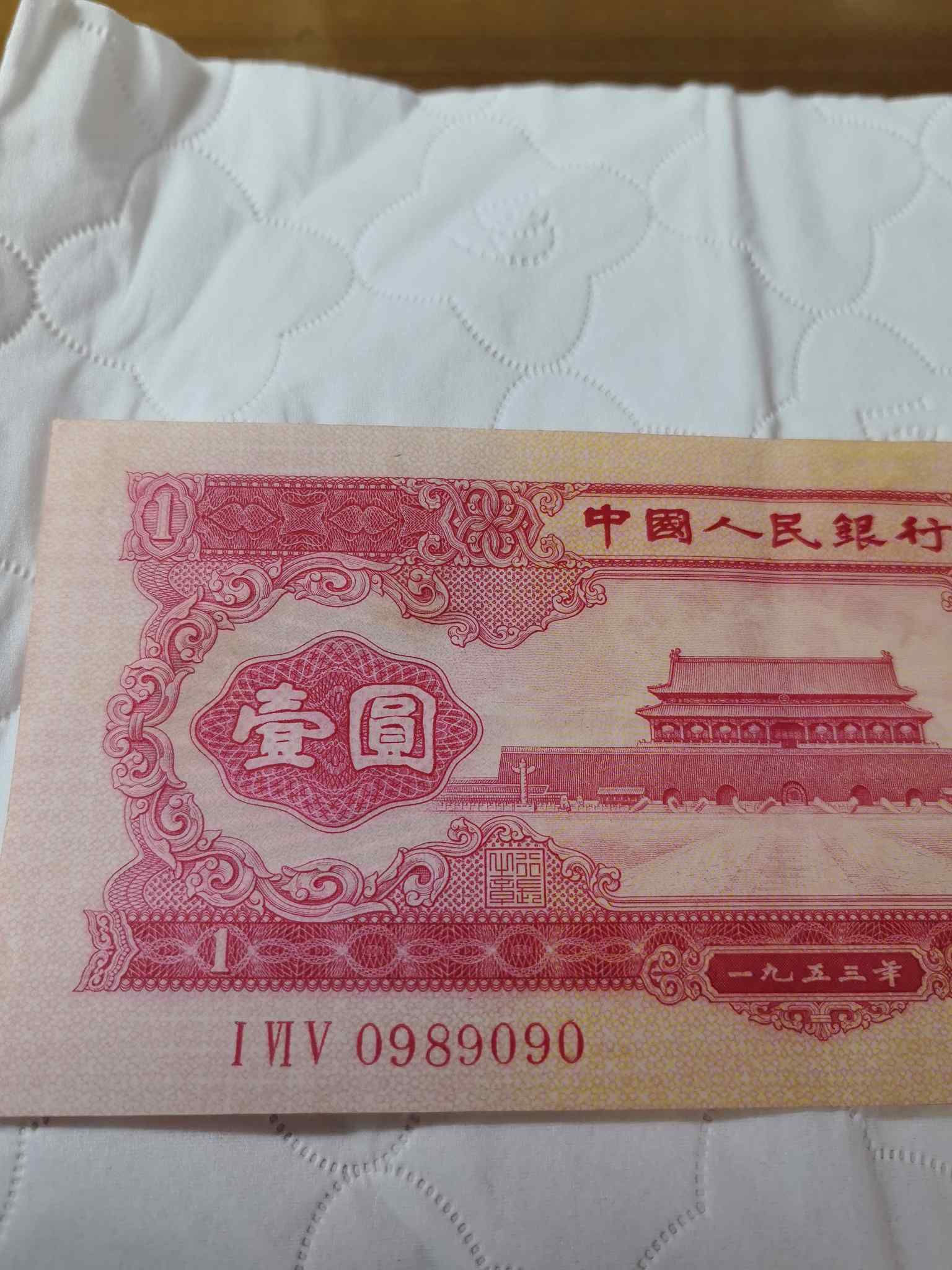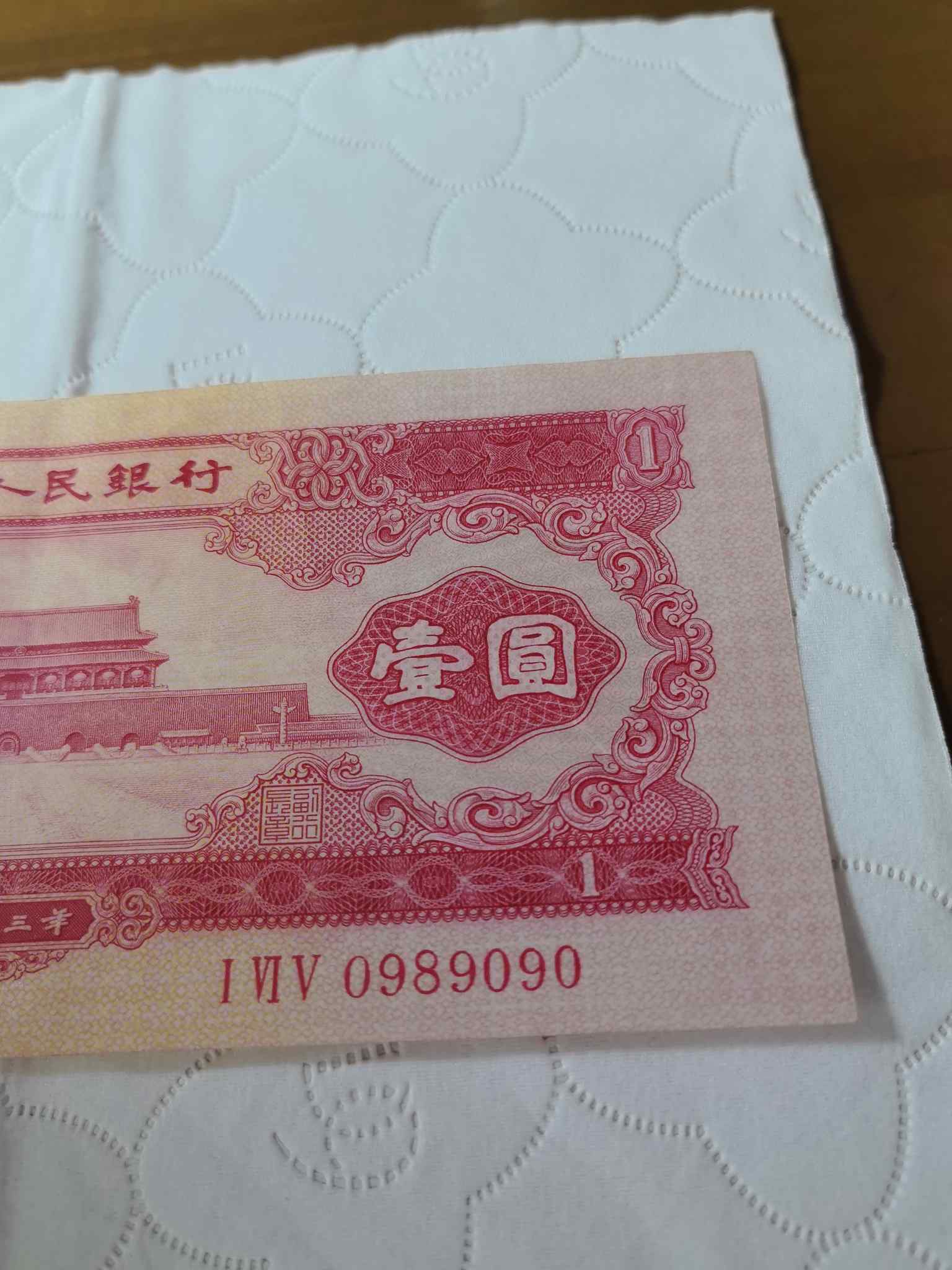 → 出手无死折,轻微软折原票红一元倒置号0989090倒置圆圆号一张,6000元