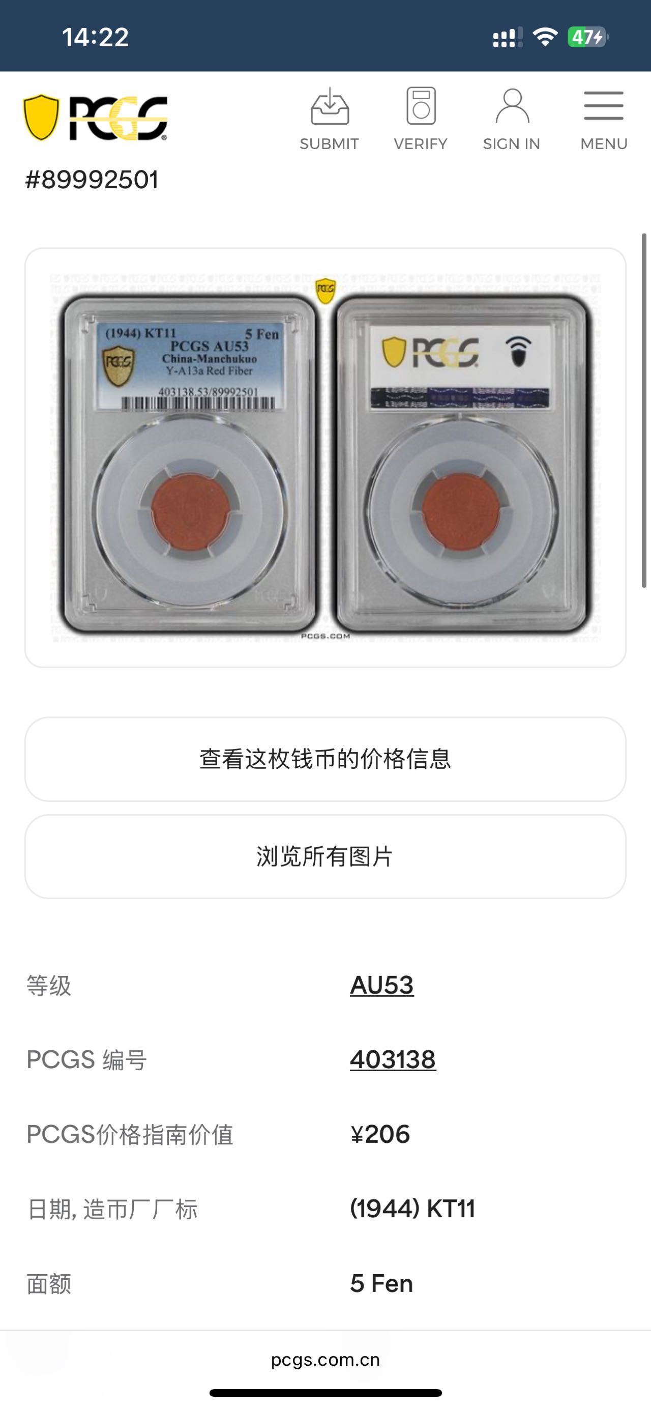 美评PCGS AU53分 少见材质 陶土币 官网206元
