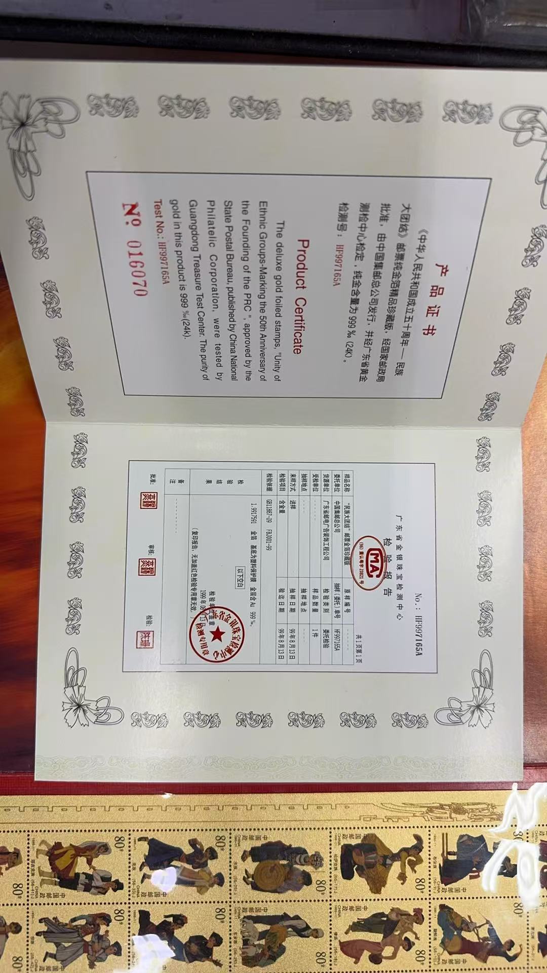 如图出售总公司民族大团结金箔张,1.99克,950元/克,带检定证书,不经常在线,款到通知我发货!
