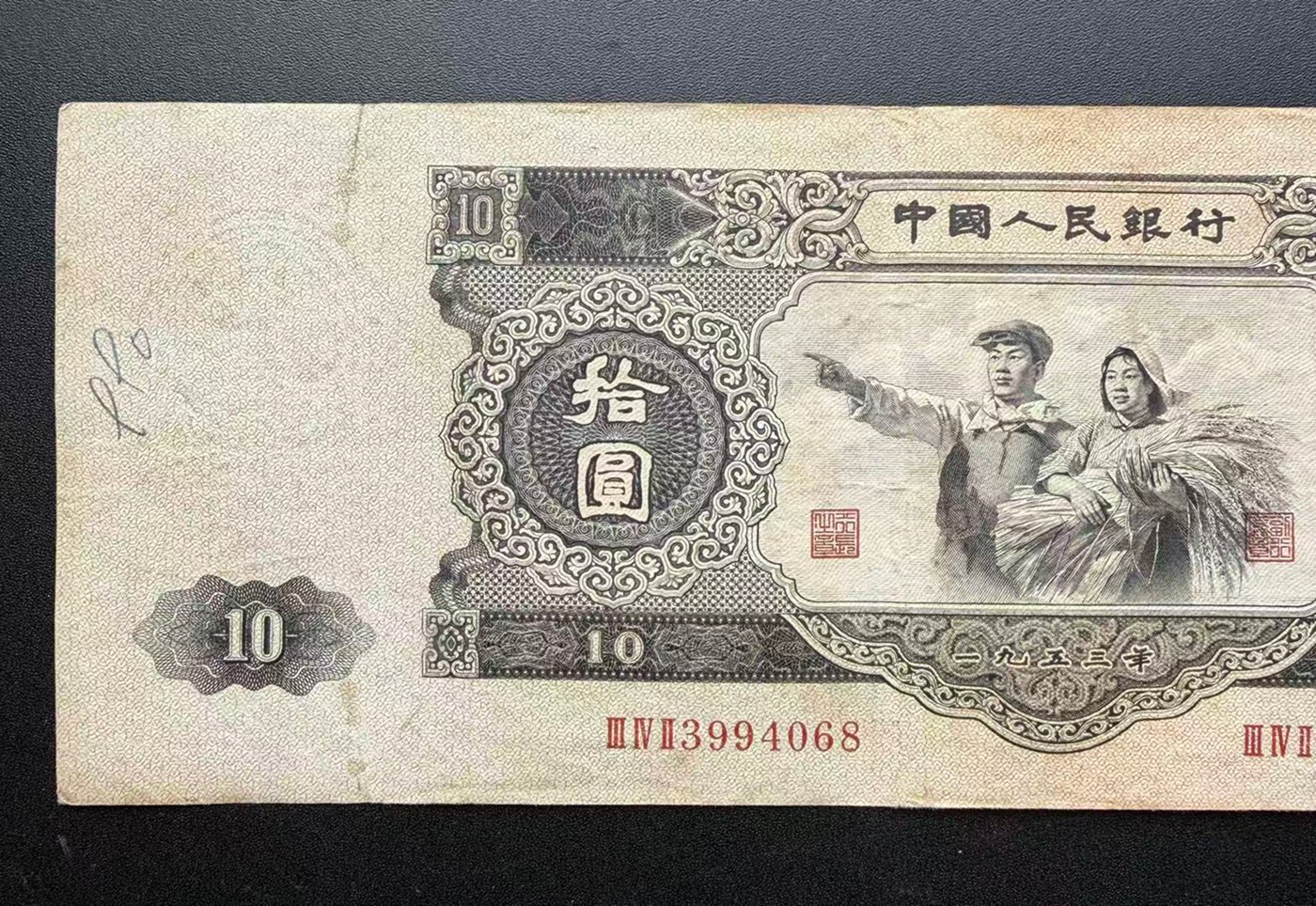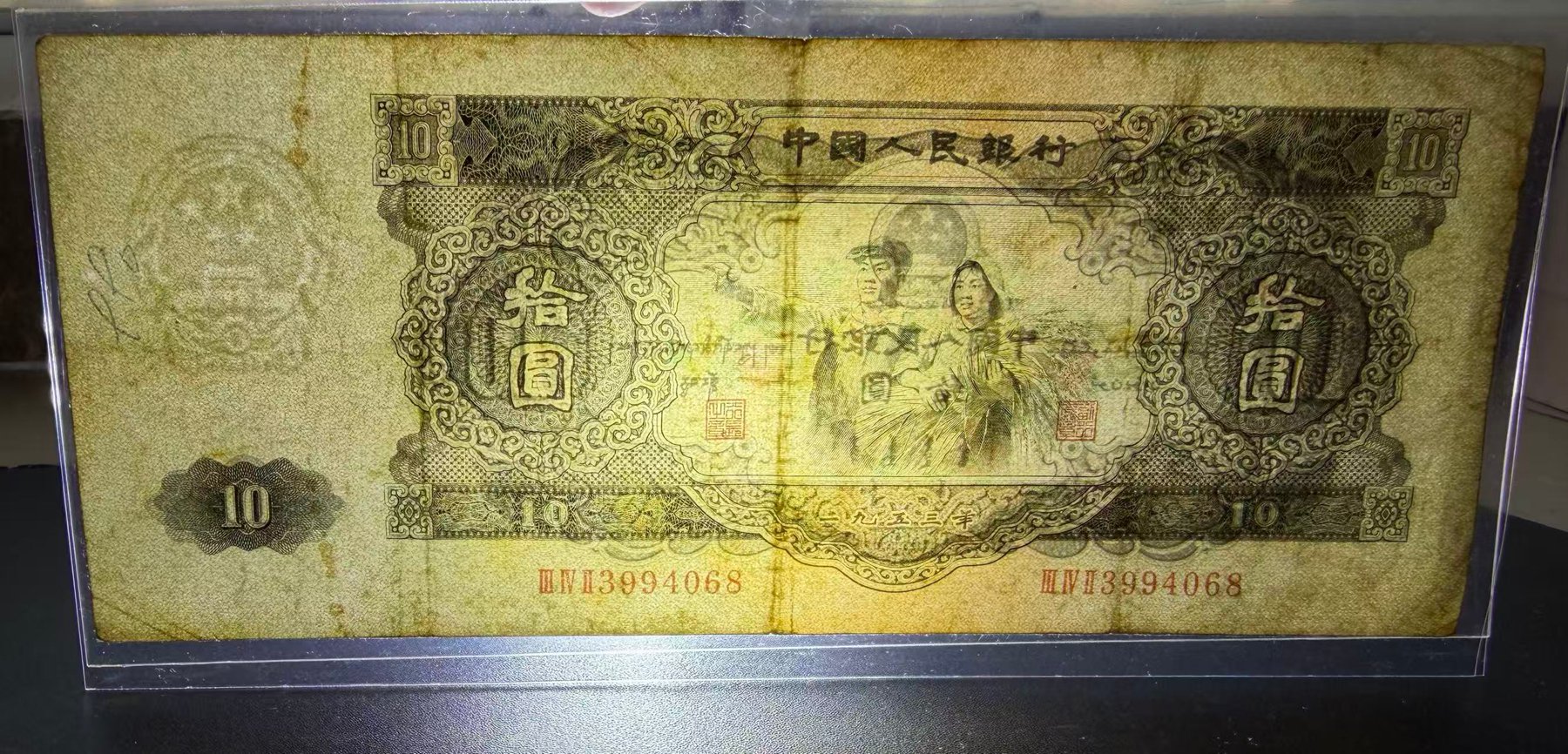 如题见图,1953年大黑拾ⅢⅣⅡ3994068原票大白边, 售70000元,本人四十八小时无操作视为撤贴