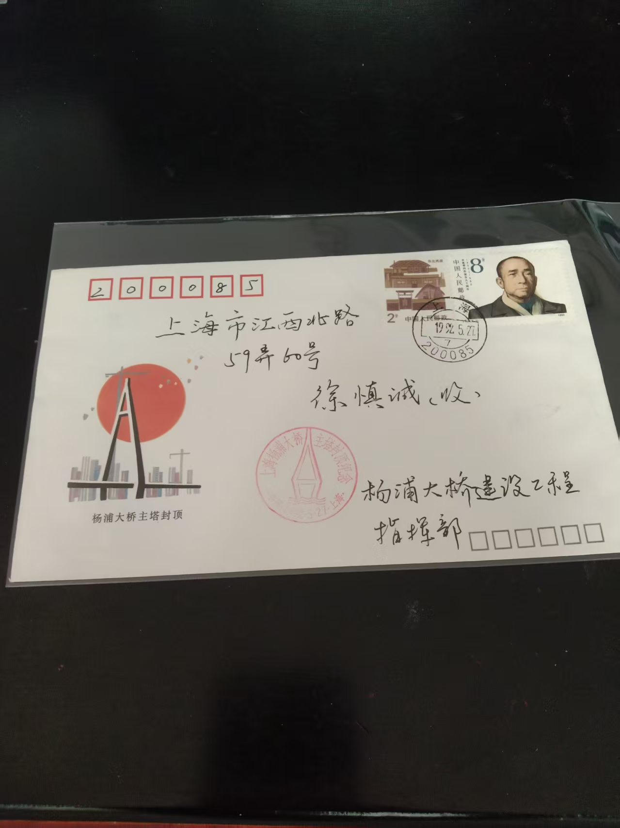 杨浦大桥主塔封顶纪念,首日实寄封。15元。