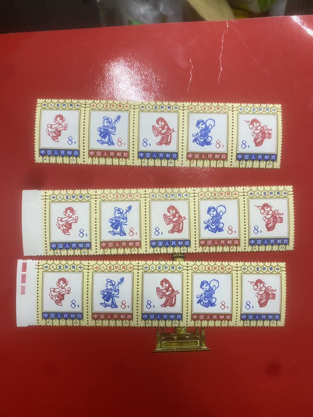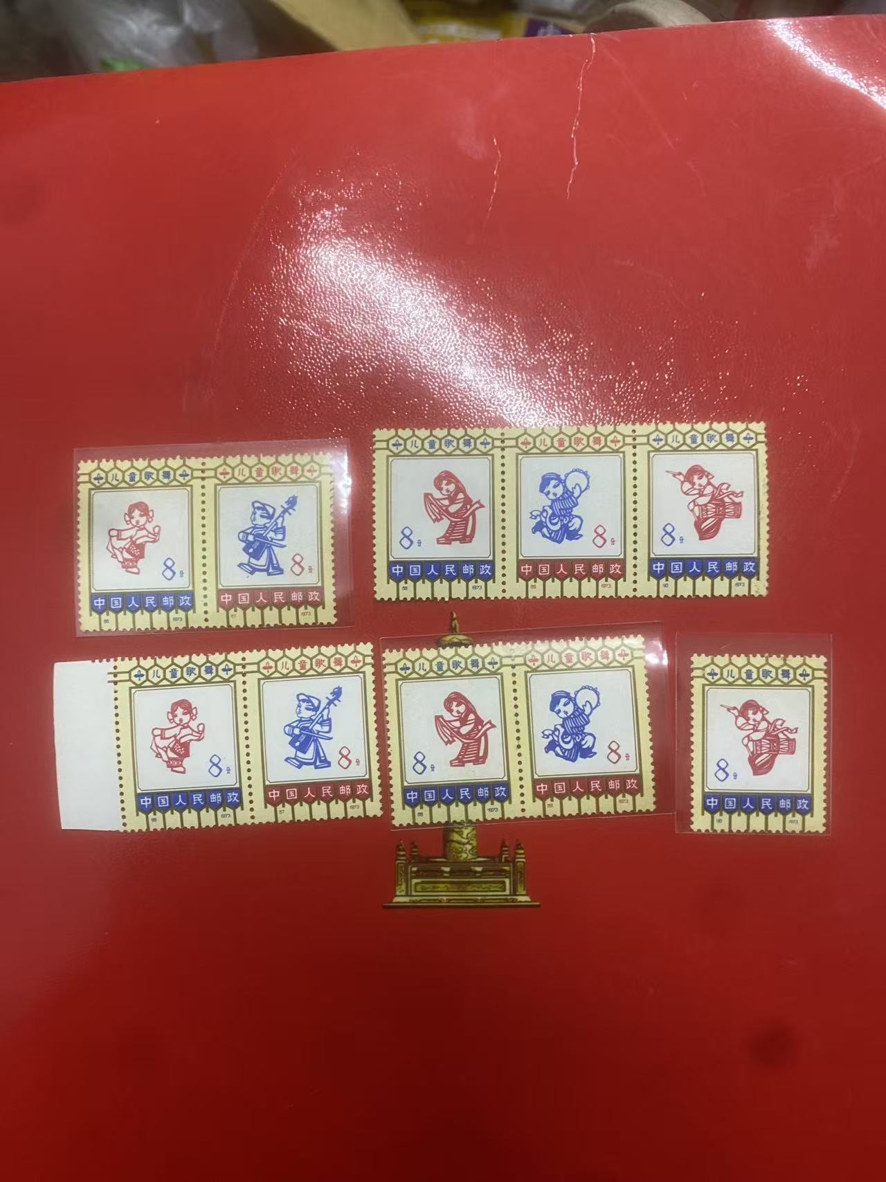 歌舞 第一组上两个第二排折齿 下面的第三排折齿3套不黄 还有一套厂铭直角边有黄 第二排第四排有折齿 第三组上面一张不黄第二排折齿 下面2套微黄 第二套第三排折齿 下面一张红色标的第一排和第四排折齿 最后3套断了 一共 10套 500元