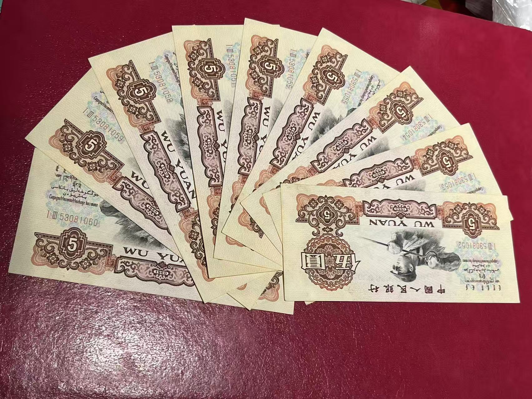 炼钢五元标十连,直板全品,第一张微黄斑,售2650元,包邮顺丰,包真包原票,可以加手机微信看更多图