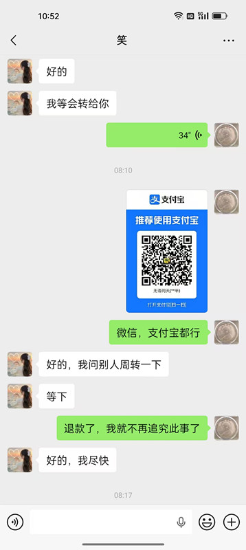 28号中午,温凯用大号联系我了(手机号13233135888,据他说一尘大号:小温古玩收藏),答应3点之前退款,3点后可以平台投诉