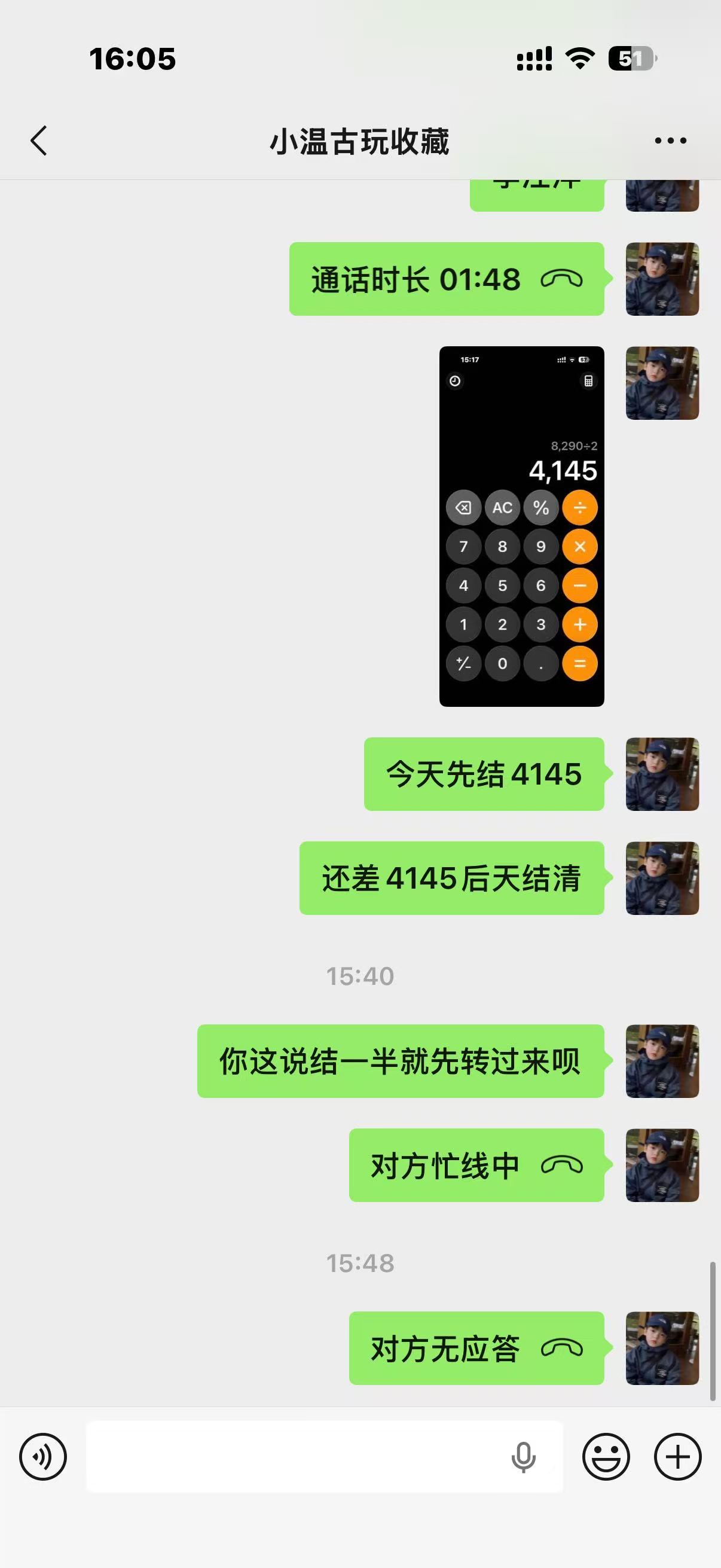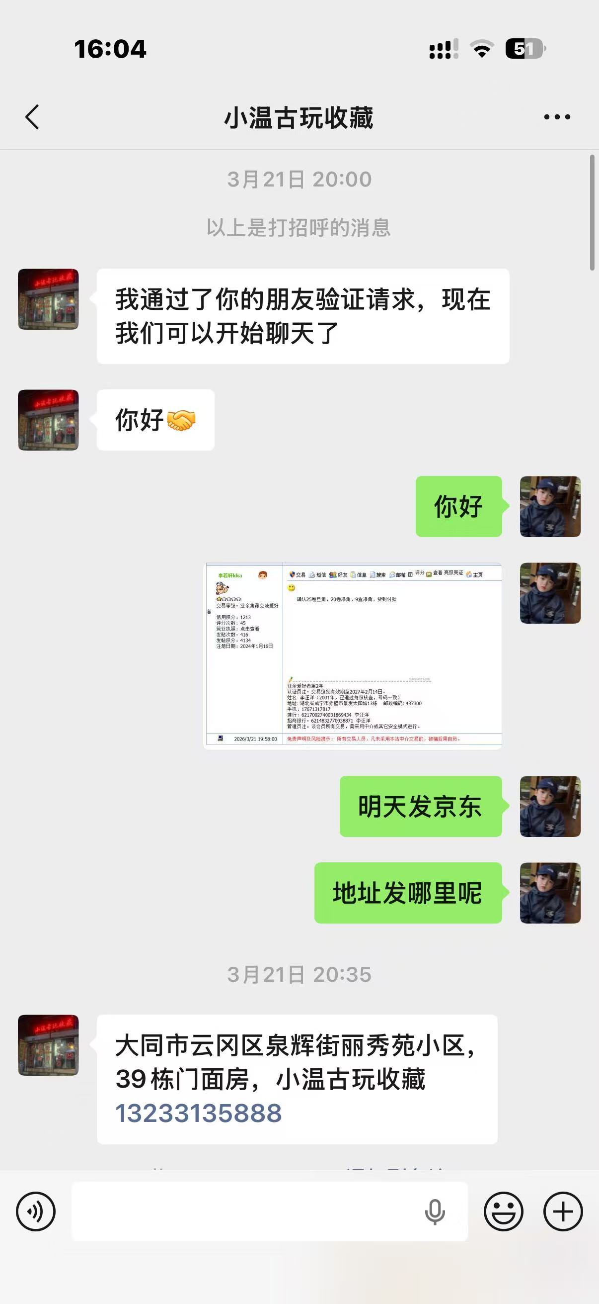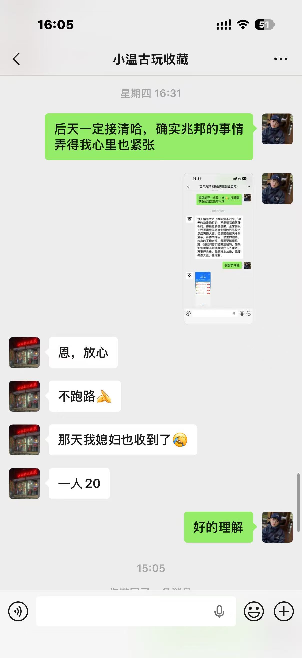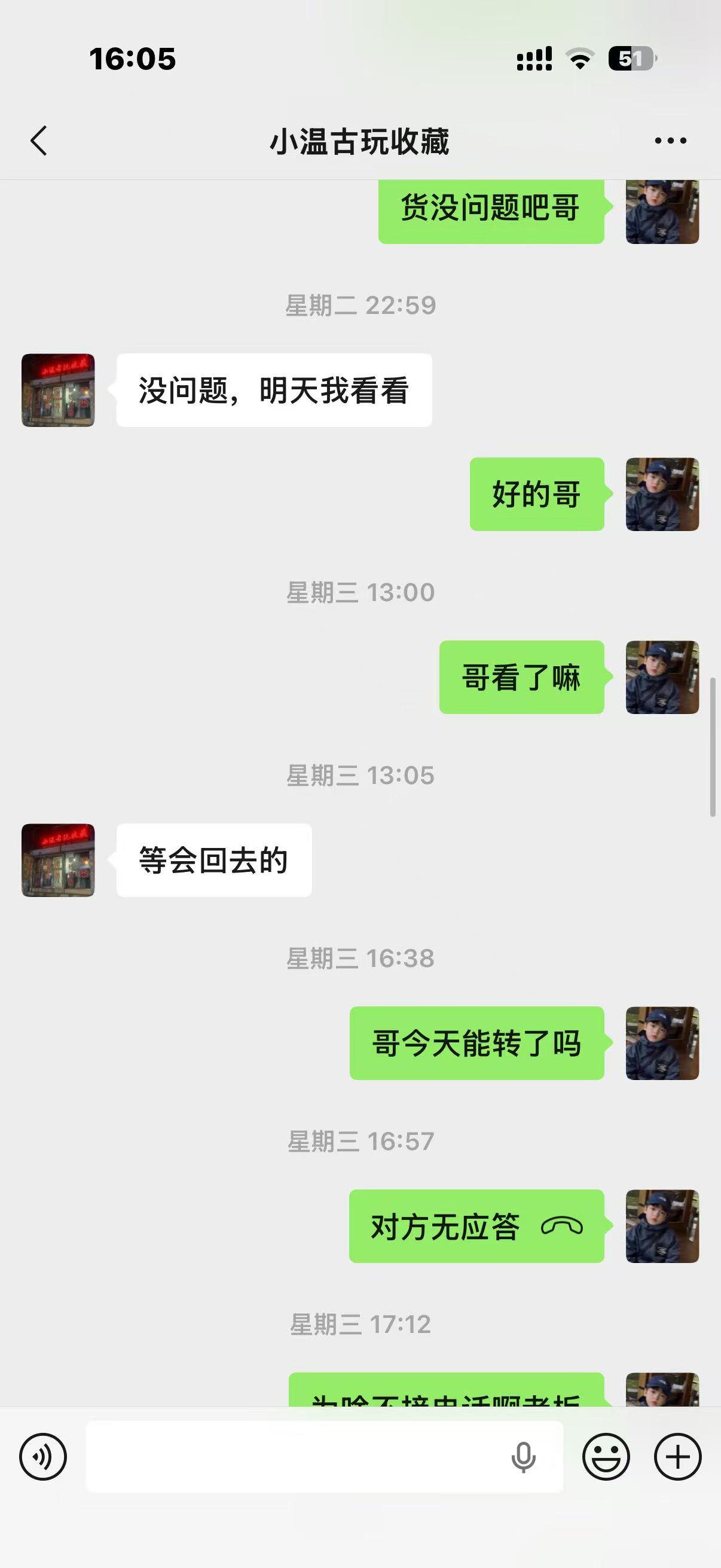 3月28日 对方依旧不给结账,理由依旧是银行卡被封,可能是我比较好说话三番五次答应好了又延迟结账,对方目前不退货也不结款,期间有一位一尘的朋友也告知我温凯欠货款没结,今天在投诉贴也有投诉他不退款的,请版主帮忙协调处理,此种收货不给钱的行为纯属于诈骗。