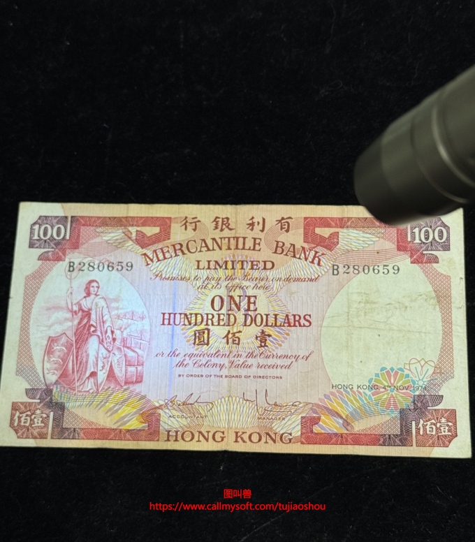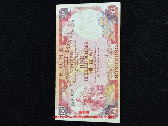 香港有利银行 1974 年发行的 100 元纸币,正面为持叉女神形象,